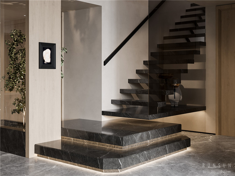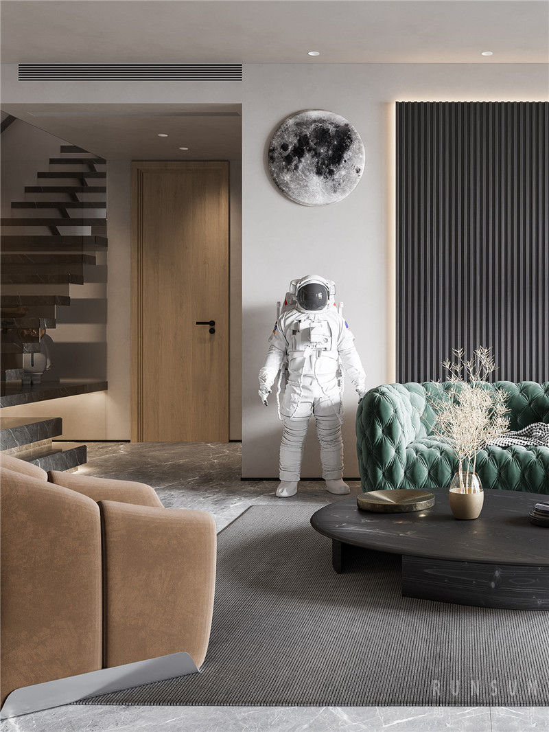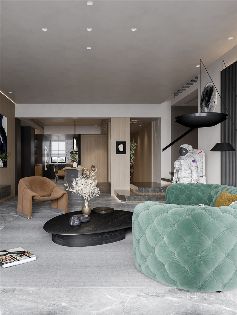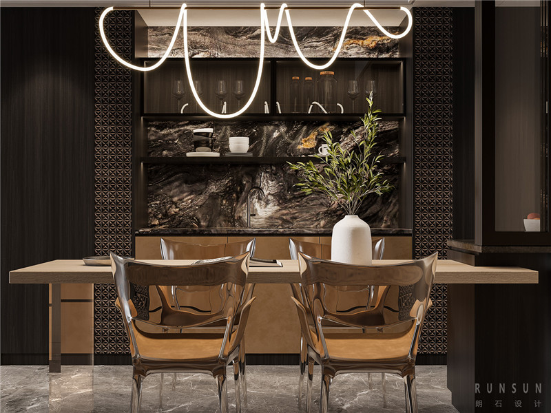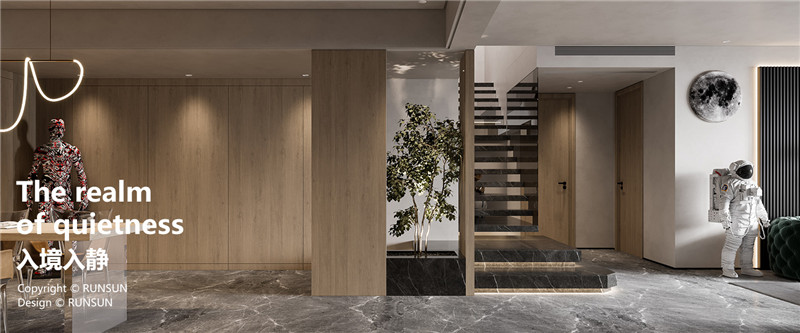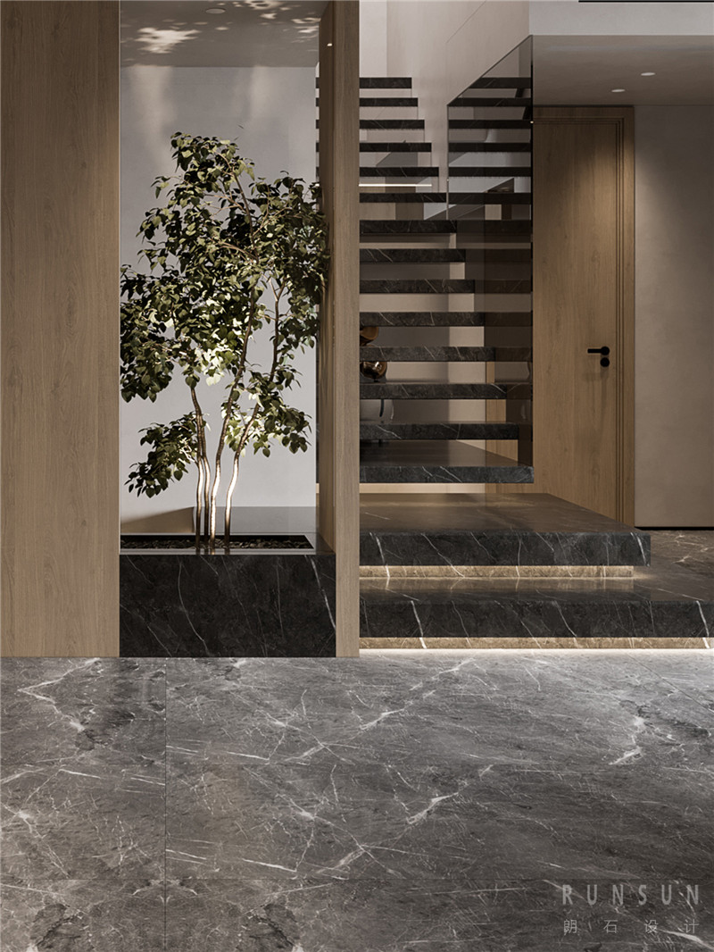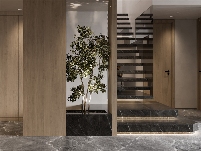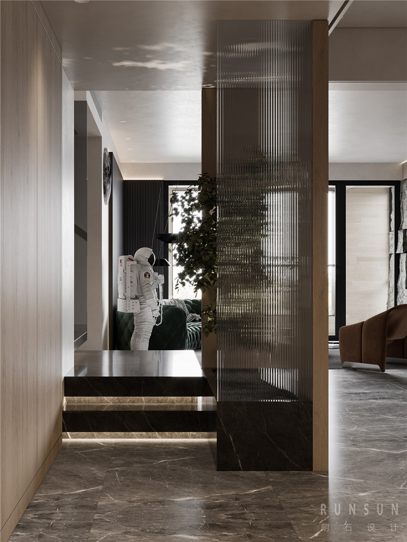 我們?cè)谛P(guān)處設(shè)置植物端景,這個(gè)端景可以在客廳,玄關(guān),餐廳被看見。但卻呈現(xiàn)不一樣的視覺效果??蛷d我們以木飾面作遮擋,僅露出端景的一點(diǎn)枝丫;玄關(guān)我們以超白玻為前置,可以看到整體植物;餐廳我們以長(zhǎng)虹玻璃為前置,打造隱約的樹影朦朧感。