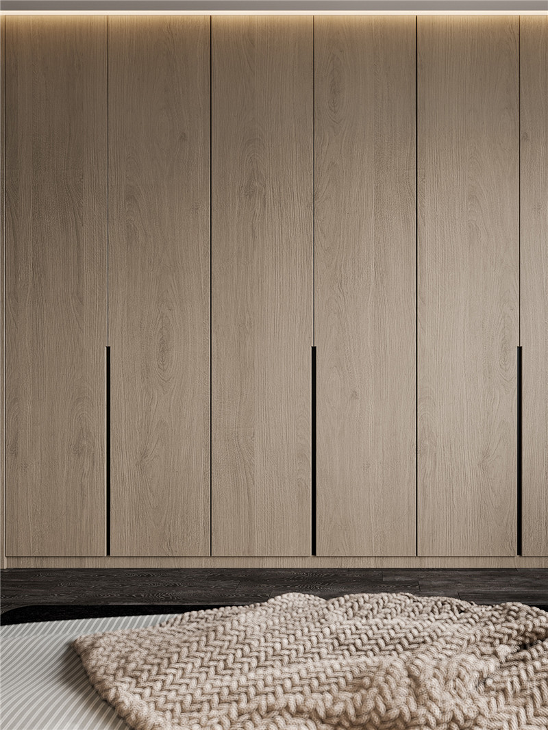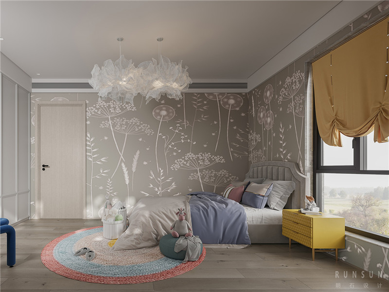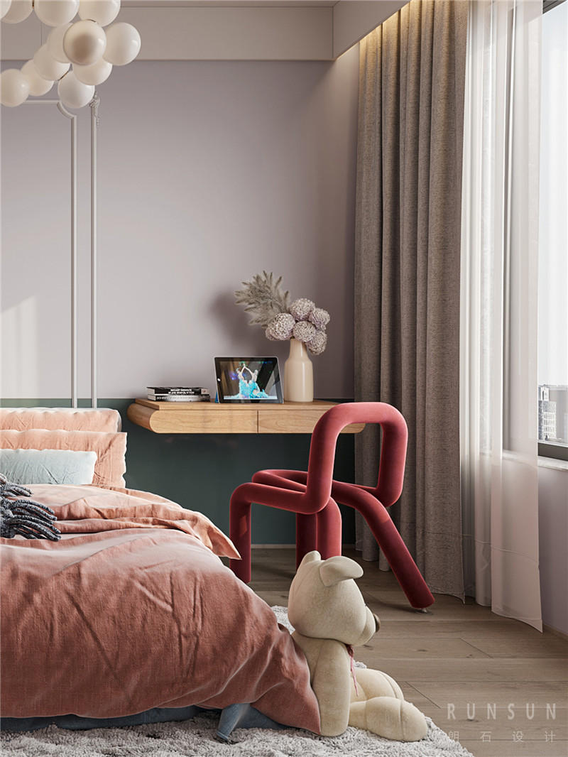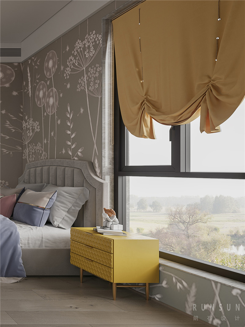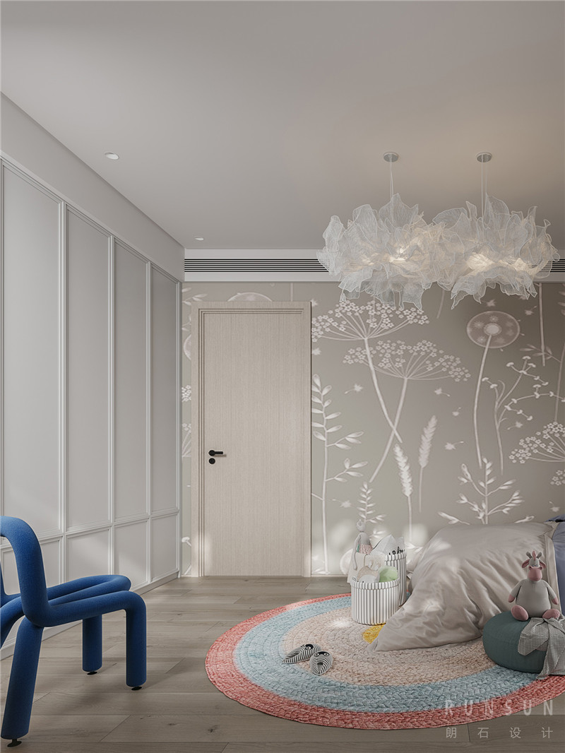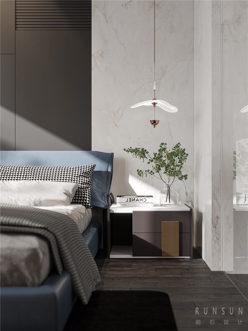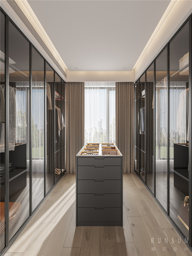 我們?cè)谛P(guān)處設(shè)置植物端景,這個(gè)端景可以在客廳,玄關(guān),餐廳被看見。但卻呈現(xiàn)不一樣的視覺效果??蛷d我們以木飾面作遮擋,僅露出端景的一點(diǎn)枝丫;玄關(guān)我們以超白玻為前置,可以看到整體植物;餐廳我們以長(zhǎng)虹玻璃為前置,打造隱約的樹影朦朧感。
