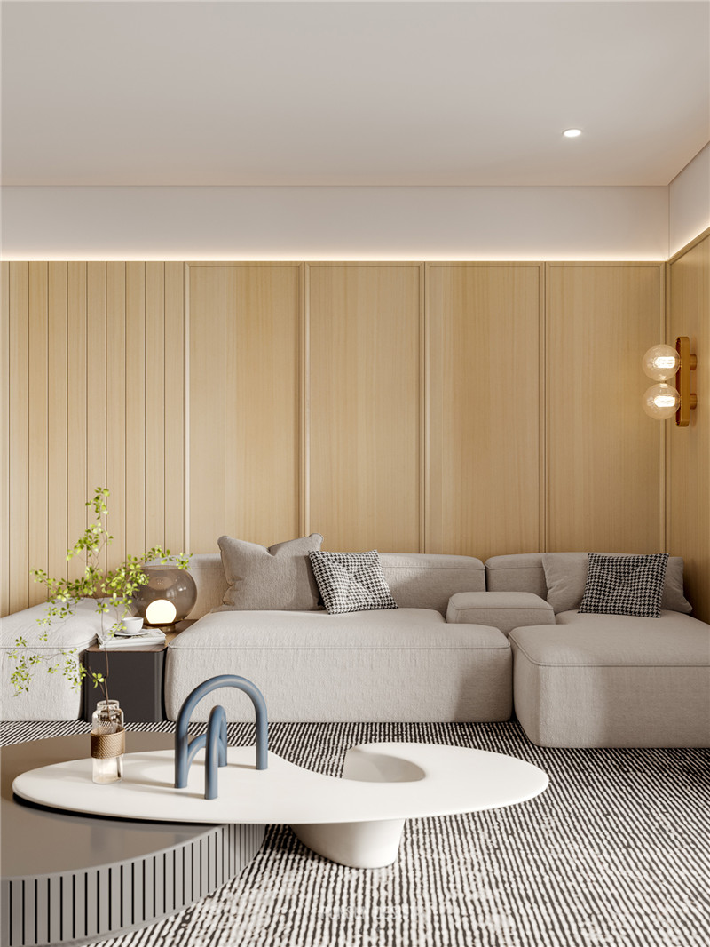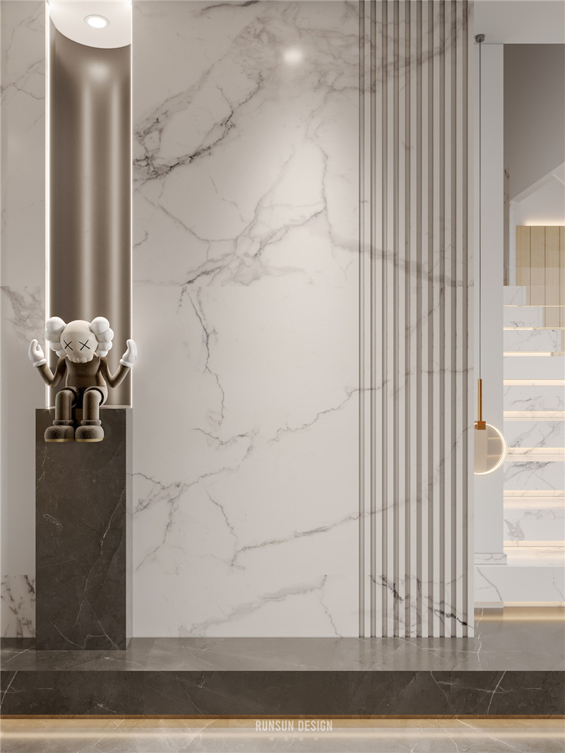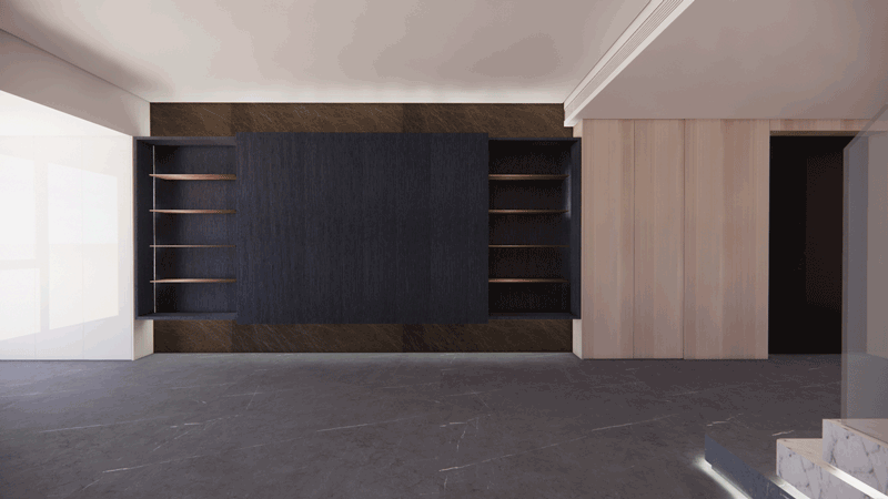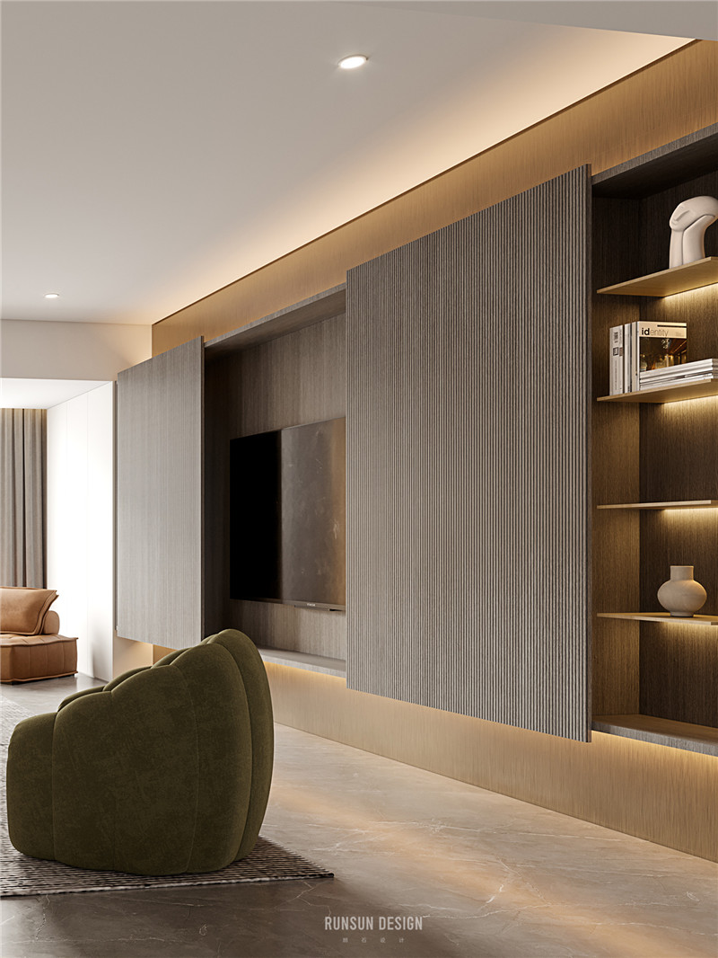 電視背景墻設(shè)計(jì)上,采用開合的移門設(shè)計(jì)。閉合時(shí)隱藏電視機(jī)并打開展示柜,將精致的藝術(shù)品展現(xiàn)出來。移門開啟時(shí),電視的精彩世界透過門洞緩緩展現(xiàn)在眼前,正是“雙闕曙光分。彩仗迎春日,香煙接瑞雪”。