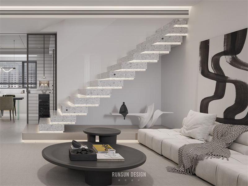略帶復(fù)古材質(zhì)的白色水磨石鑲嵌在樓梯上