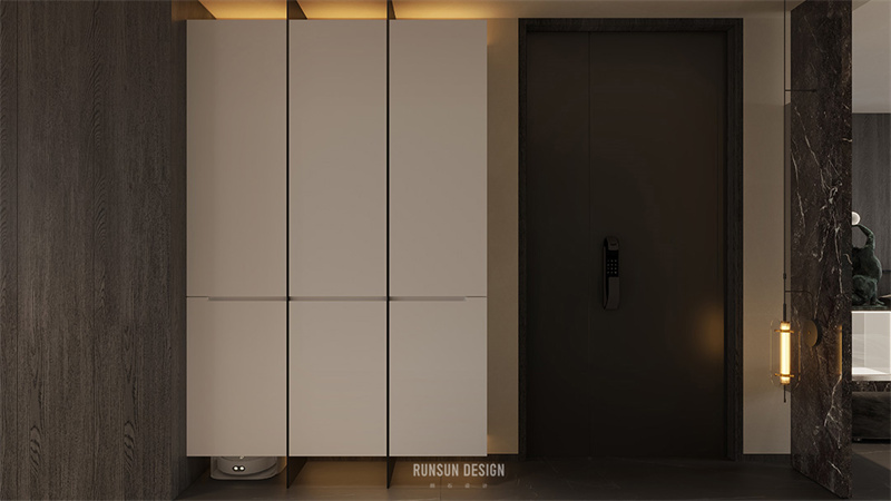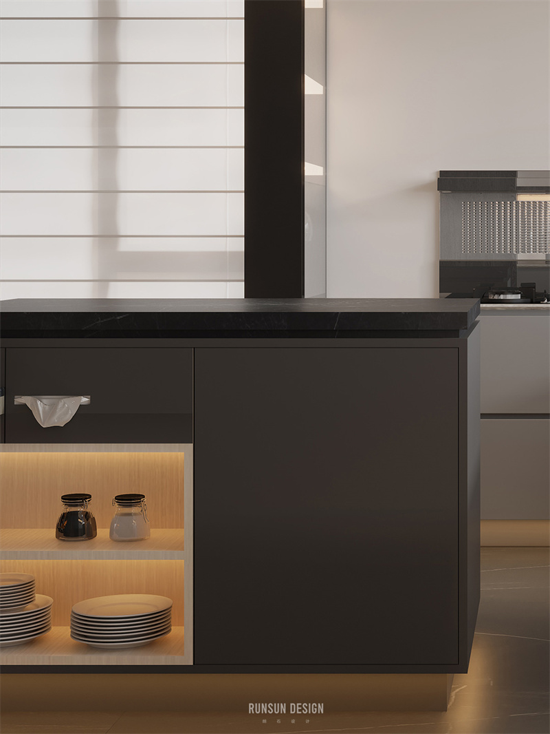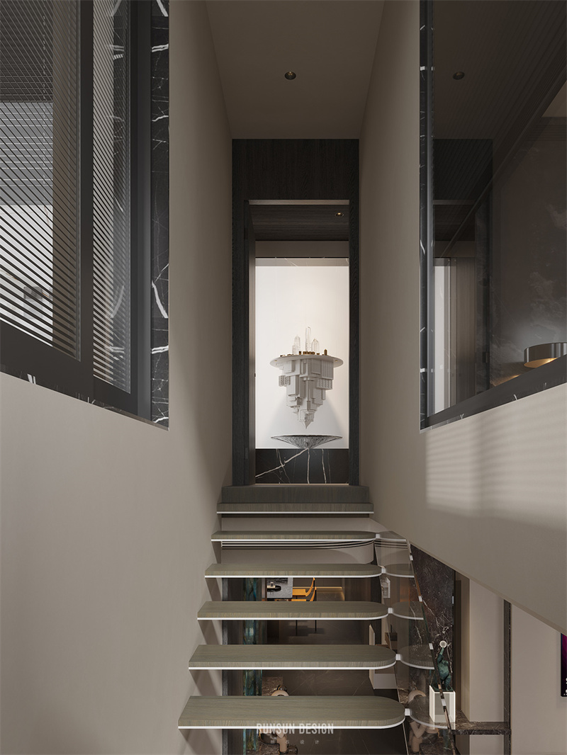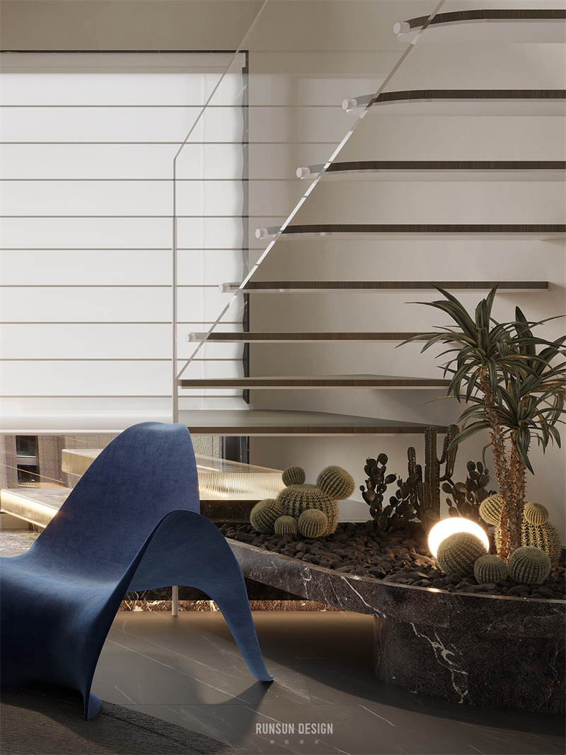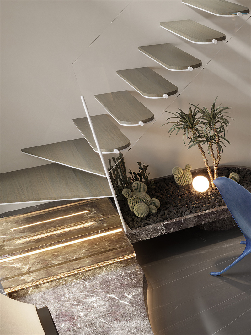 我們在樓梯的設(shè)計(jì)中投入大量的思考時(shí)間,從工藝上解決超薄樓梯踏步的施工問題,打造一個(gè)極具光感的樓梯,第一二階踏步采用水晶磚制作,將玄關(guān)以左的視野完全打開,且現(xiàn)代科技感十足。