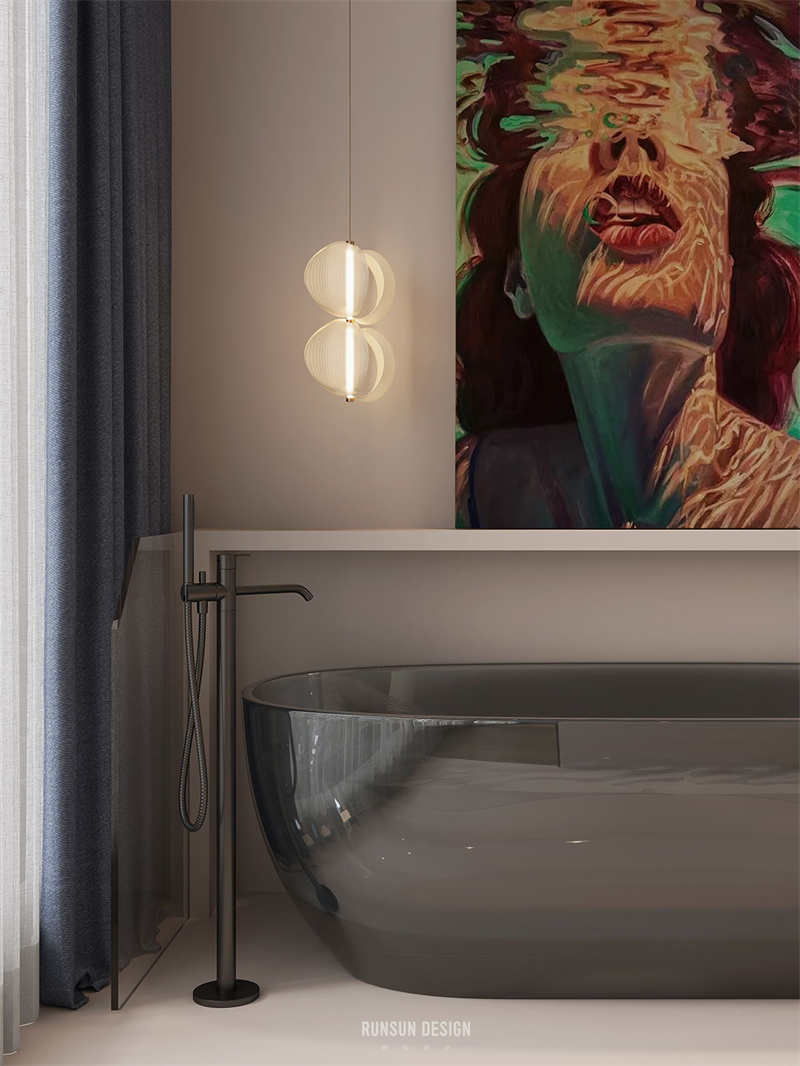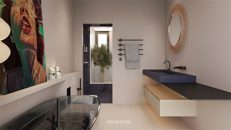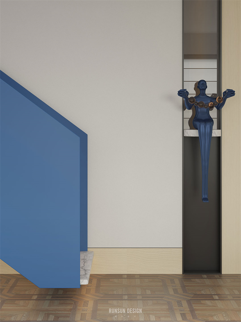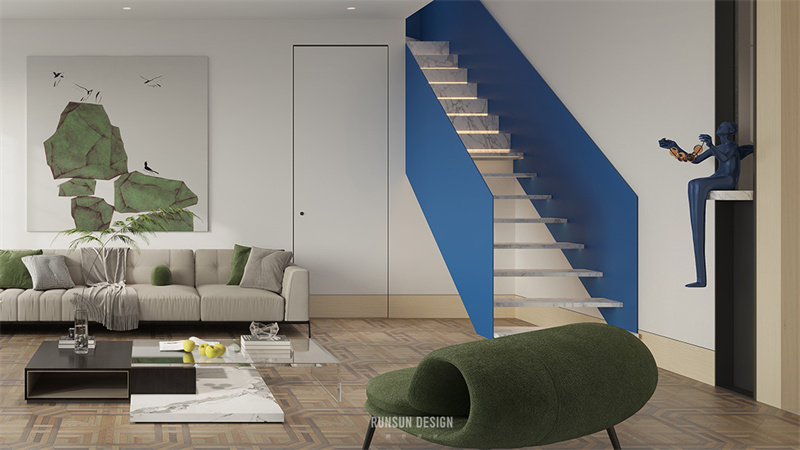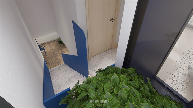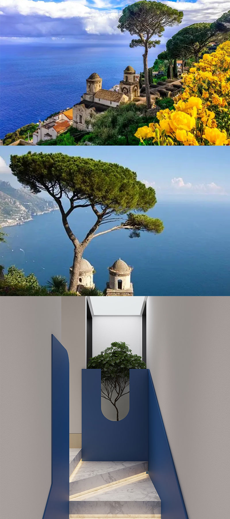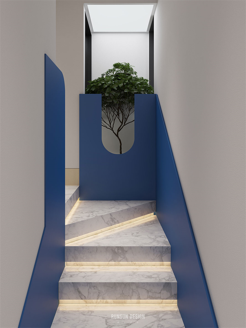 本案立意阿馬爾菲海岸,室內(nèi)樓梯造型的設(shè)計上,模擬地中海峽灣的風(fēng)景輪廓,打造一個意式風(fēng)情濃郁的室內(nèi)空間。藍色樓梯的弧度造型正如阿馬爾菲海岸的峽灣,將大海攬入懷中。而植物端景正如峽灣山坡的獨立植物,給予人獨樹一幟的視覺沖擊。