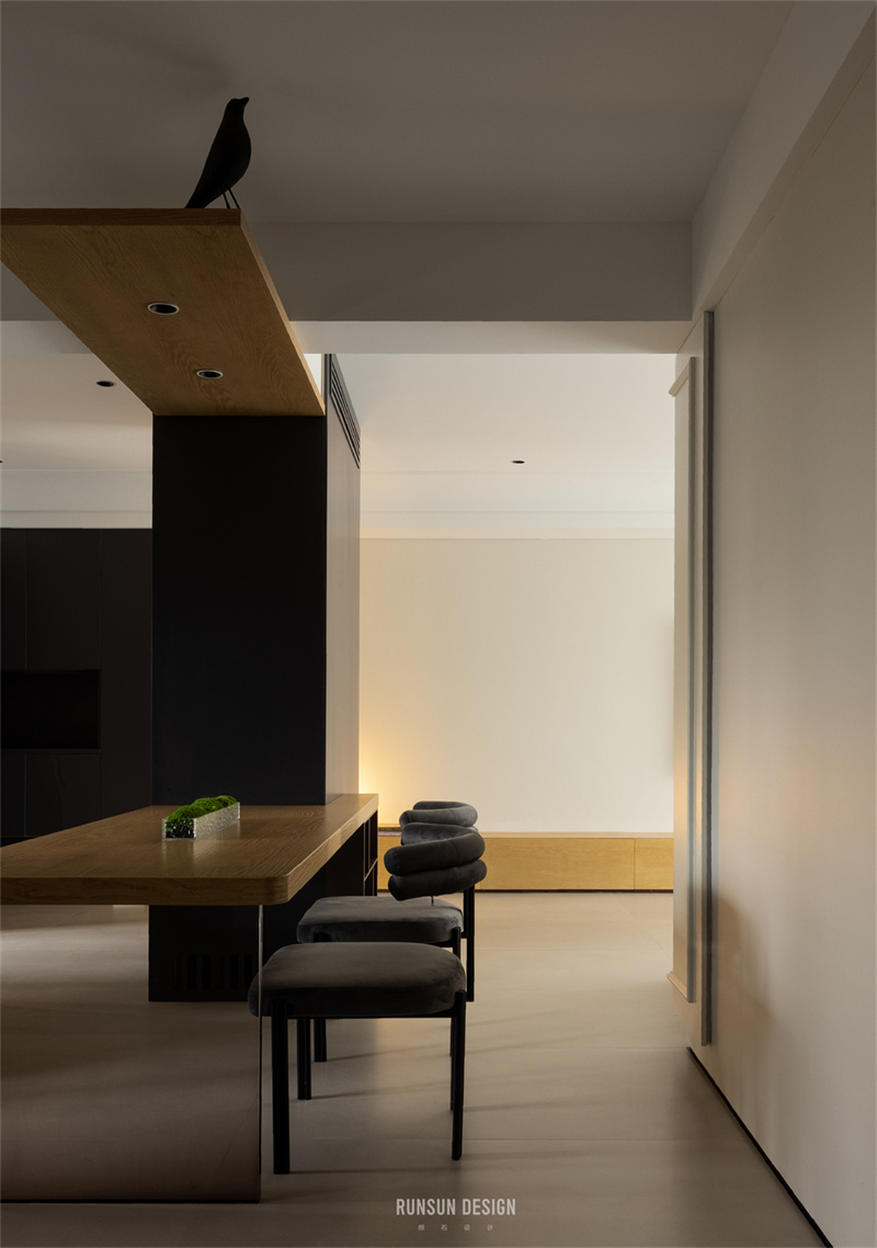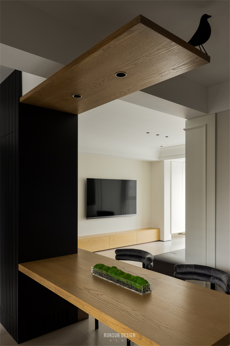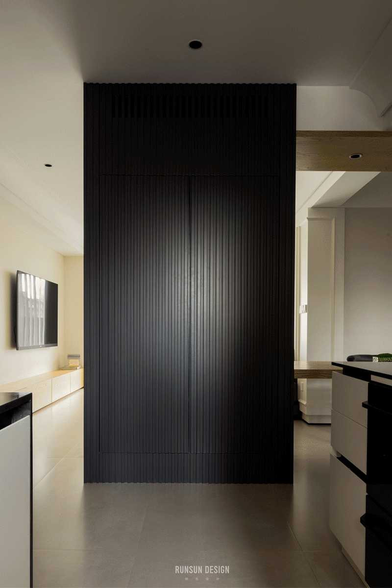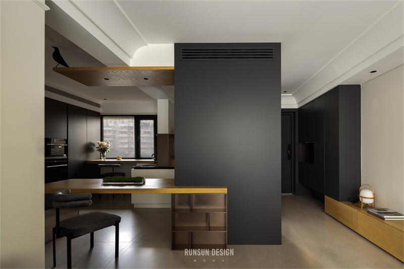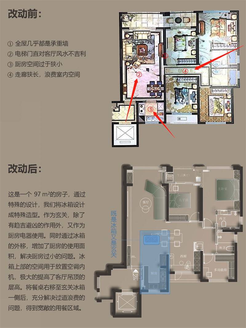 這是一個(gè)97m2的房子,通過(guò)特殊的設(shè)計(jì),我們將冰箱設(shè)計(jì)成特殊造型。作為玄關(guān),除了有趨吉避兇的作用外,又作為廚房電器使用。同時(shí)通過(guò)冰箱的外移,增加了廚房的使用面積,解決廚房過(guò)小的問題。冰箱上部的空間用于放置空調(diào)內(nèi)機(jī),極大的提高了客廳吊頂?shù)膶痈?。將餐桌右移至玄關(guān)冰箱一側(cè)后,充分解決過(guò)道浪費(fèi)的問題,得到一個(gè)寬敞的用餐區(qū)域。