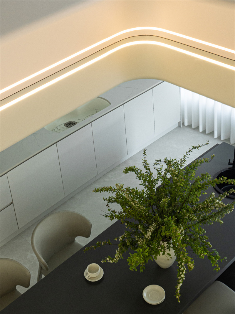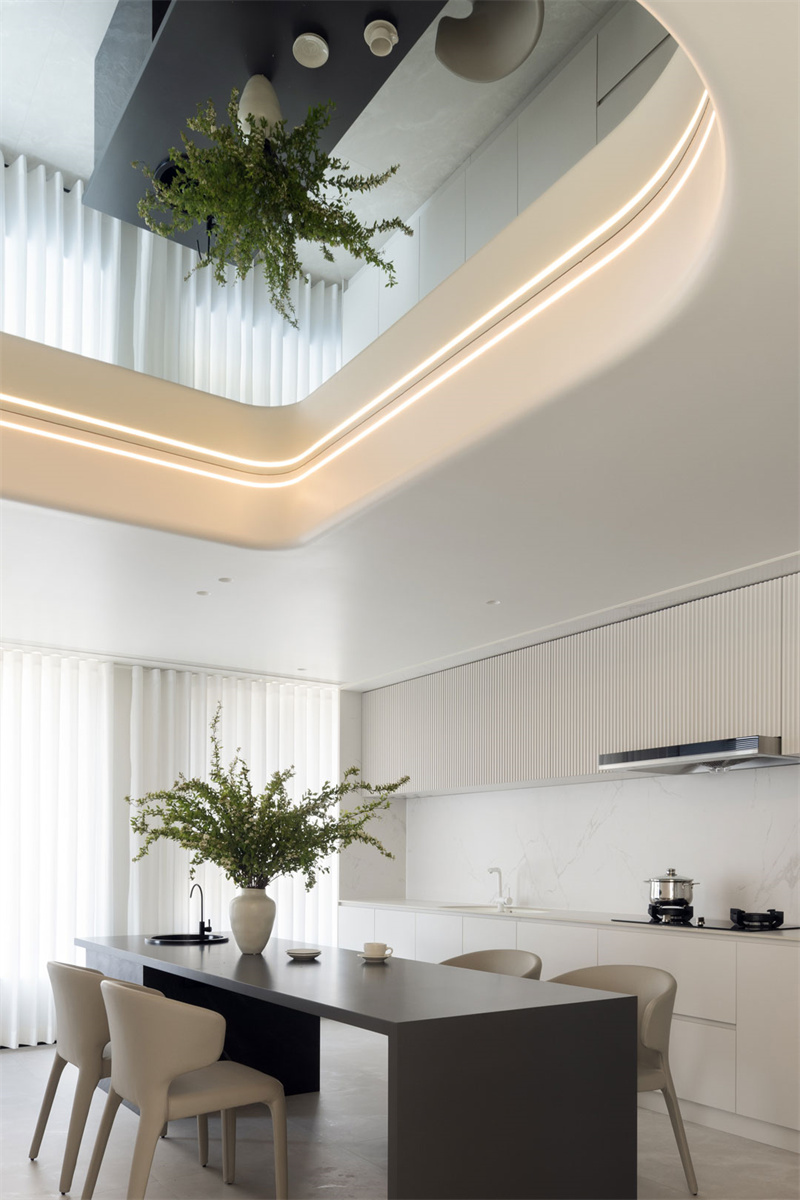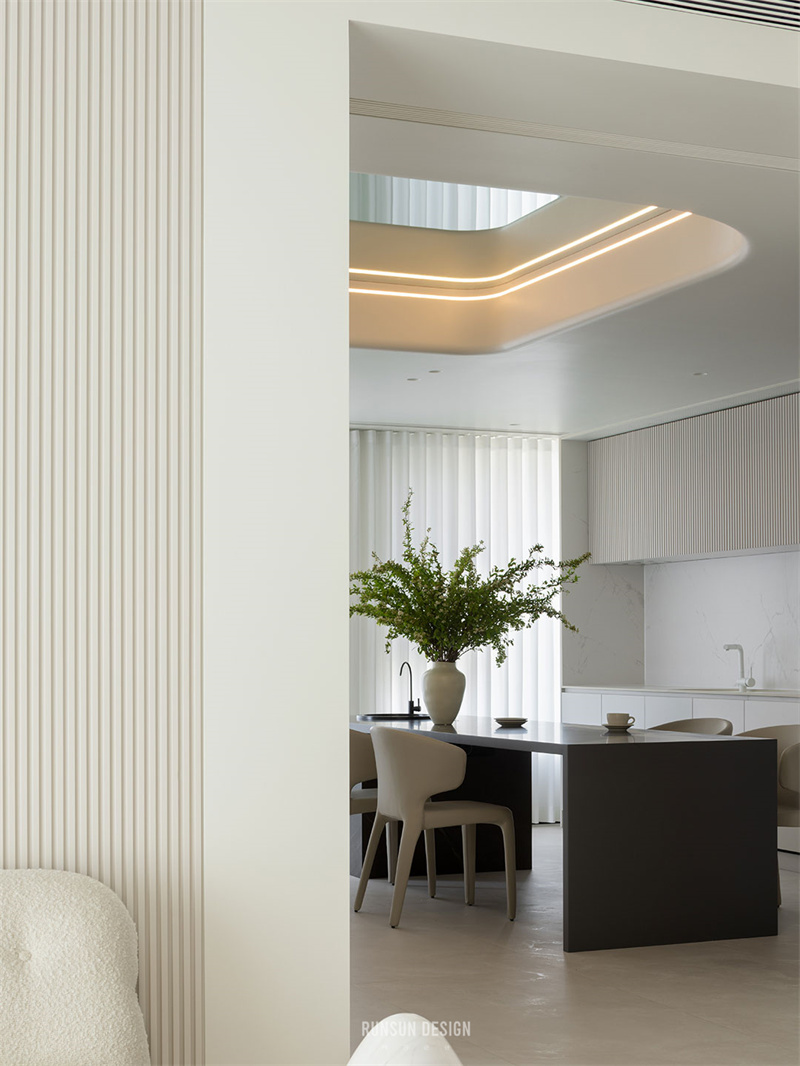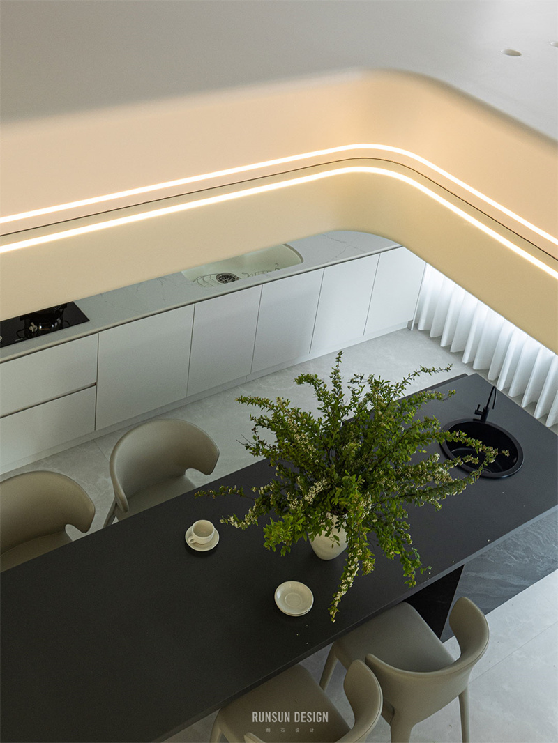 現(xiàn)代山巖質感的餐桌連通著水吧
