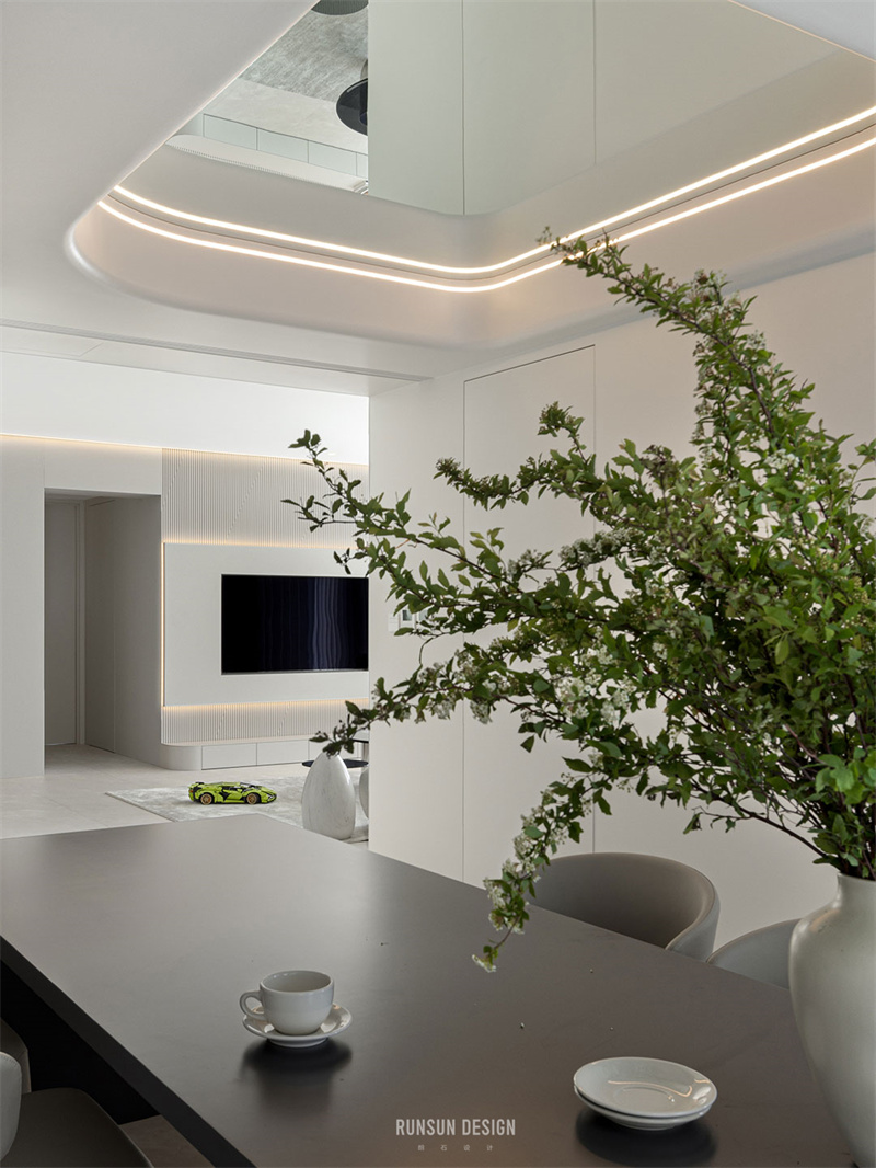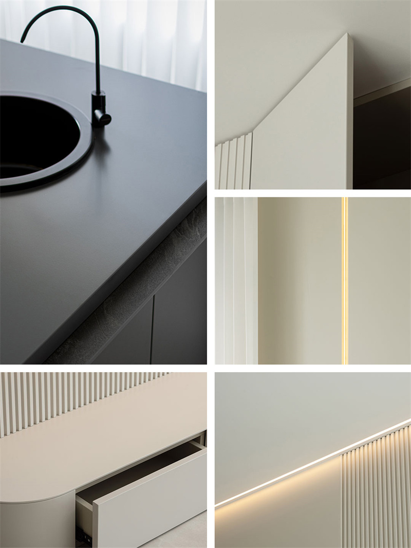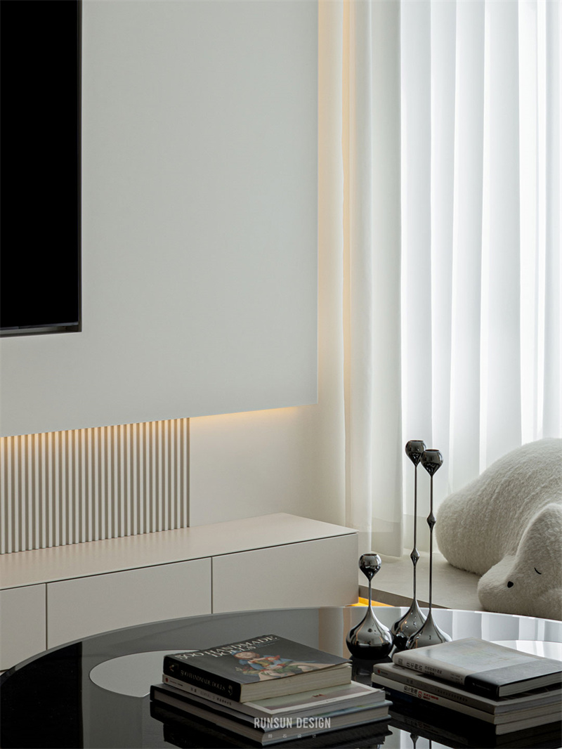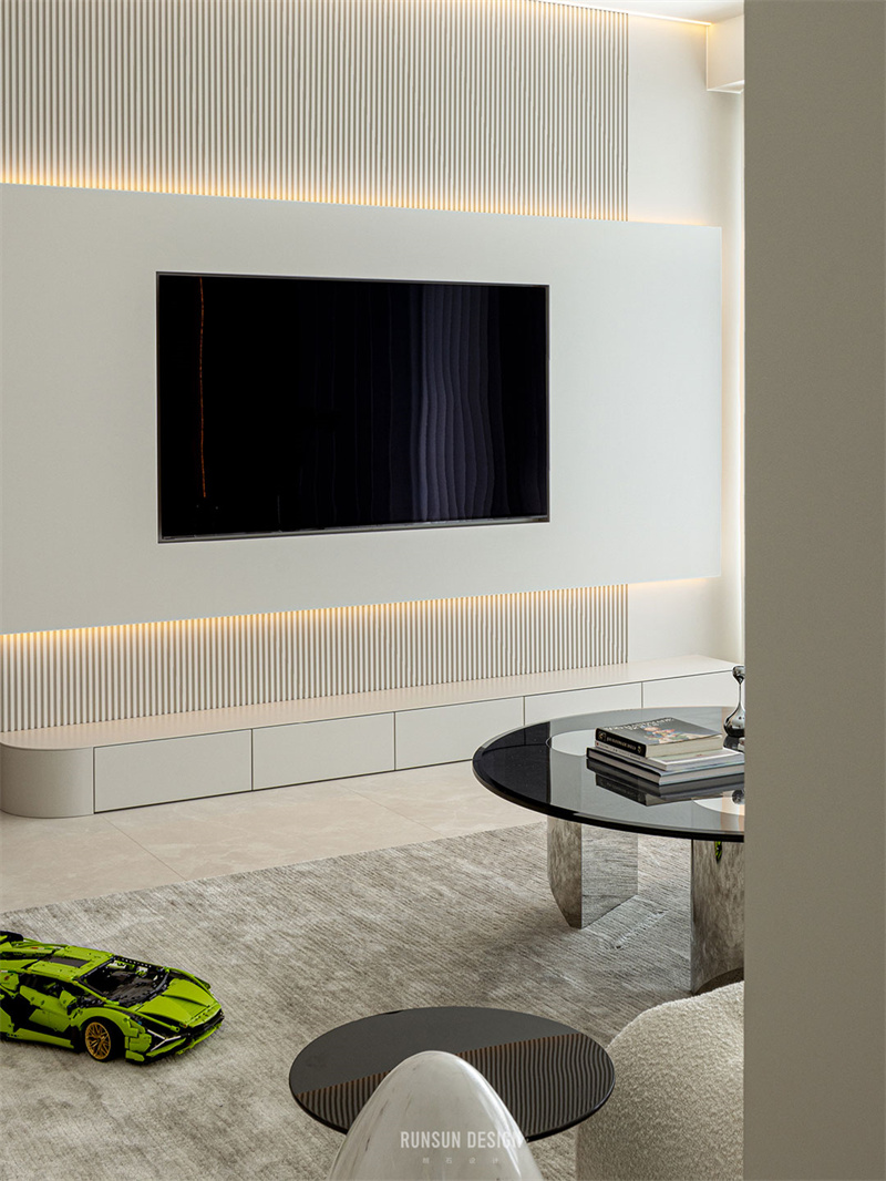 空間運用多種極簡手法,如圖一的跌級水吧臺,圖二的一門到頂,圖三圖四的線性燈帶,圖五的超薄臺面沿邊電視柜等。