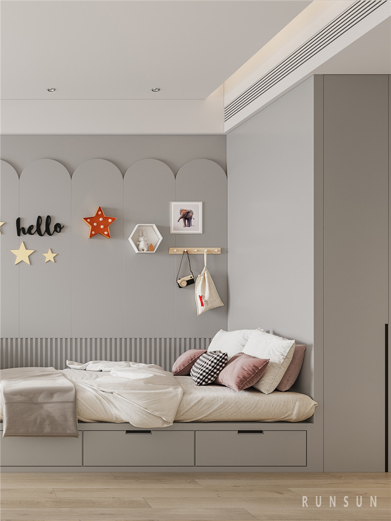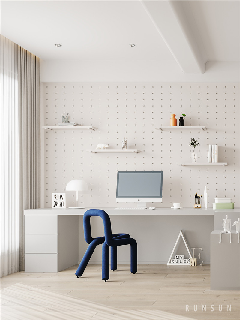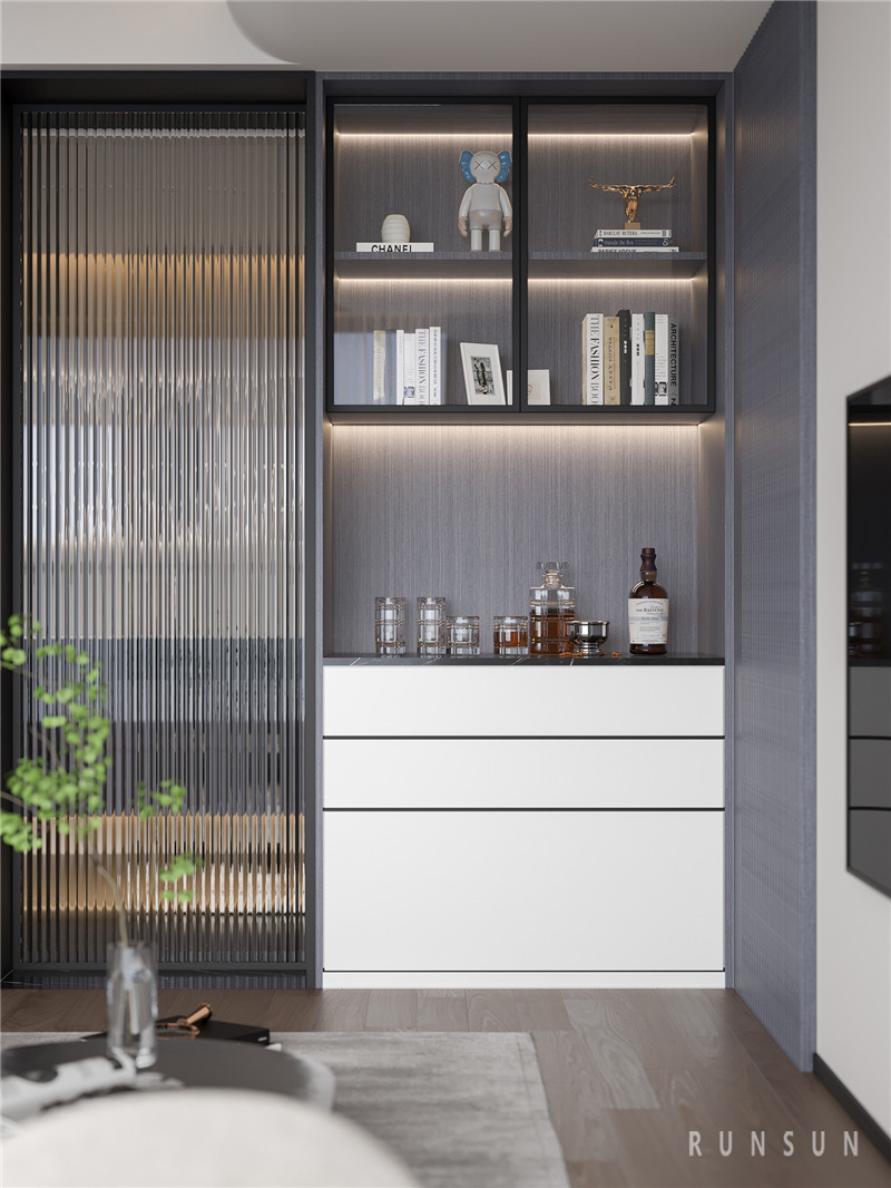 我們的業(yè)主是一位鞋子的收藏家,我們將樓梯的一整面隔墻做了新的設計——一面通透玻璃附帶琉璃燈光的球鞋展示墻,隨著踏步拾級而上,一雙雙珍藏的球鞋慢慢展示在我們面前,這是個非常有意思、有個性的空間。沿著樓梯步入二層,首先映入眼簾的是一個玻璃環(huán)繞的仙人掌端景。端景與主衛(wèi)聯(lián)通的地方有一面可以隨著控制變幻磨砂和透明兩種模式的通電霧化玻璃。將浴缸與仙人掌兩個空間的布置一下子結合在一起,妙趣橫生!