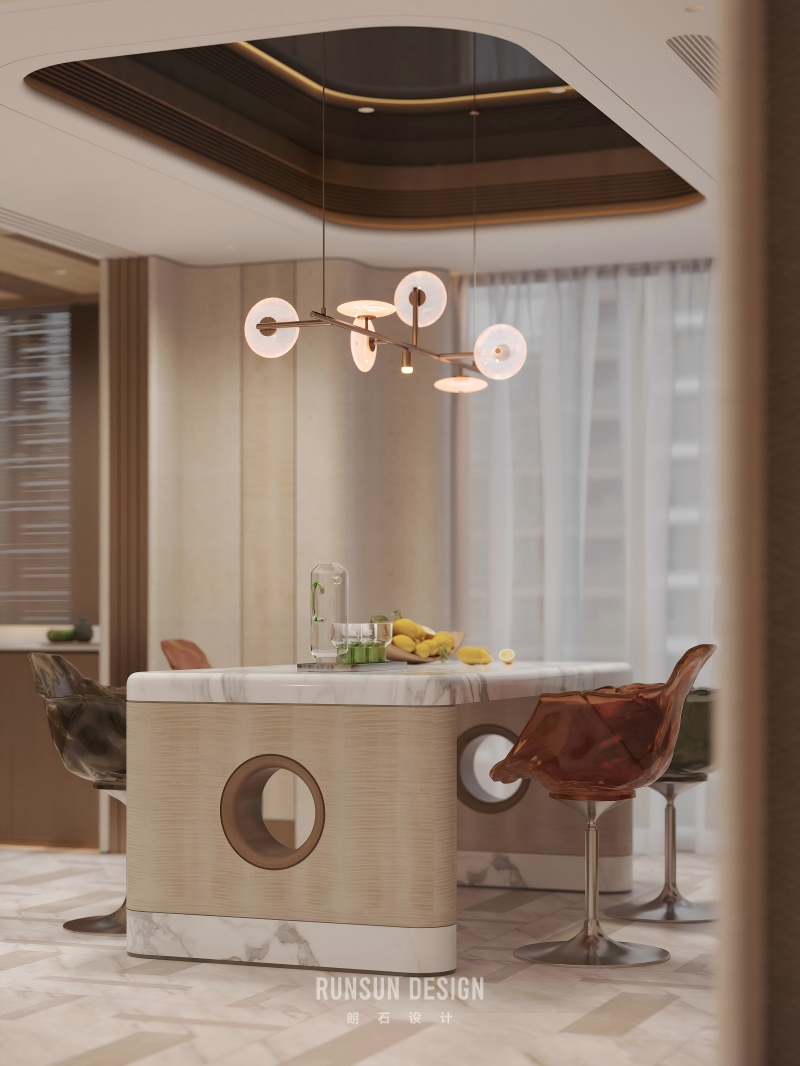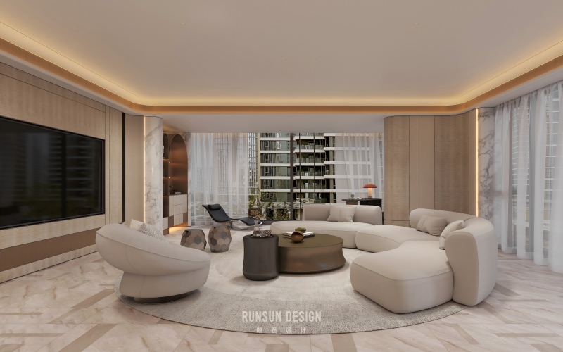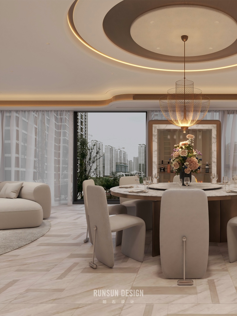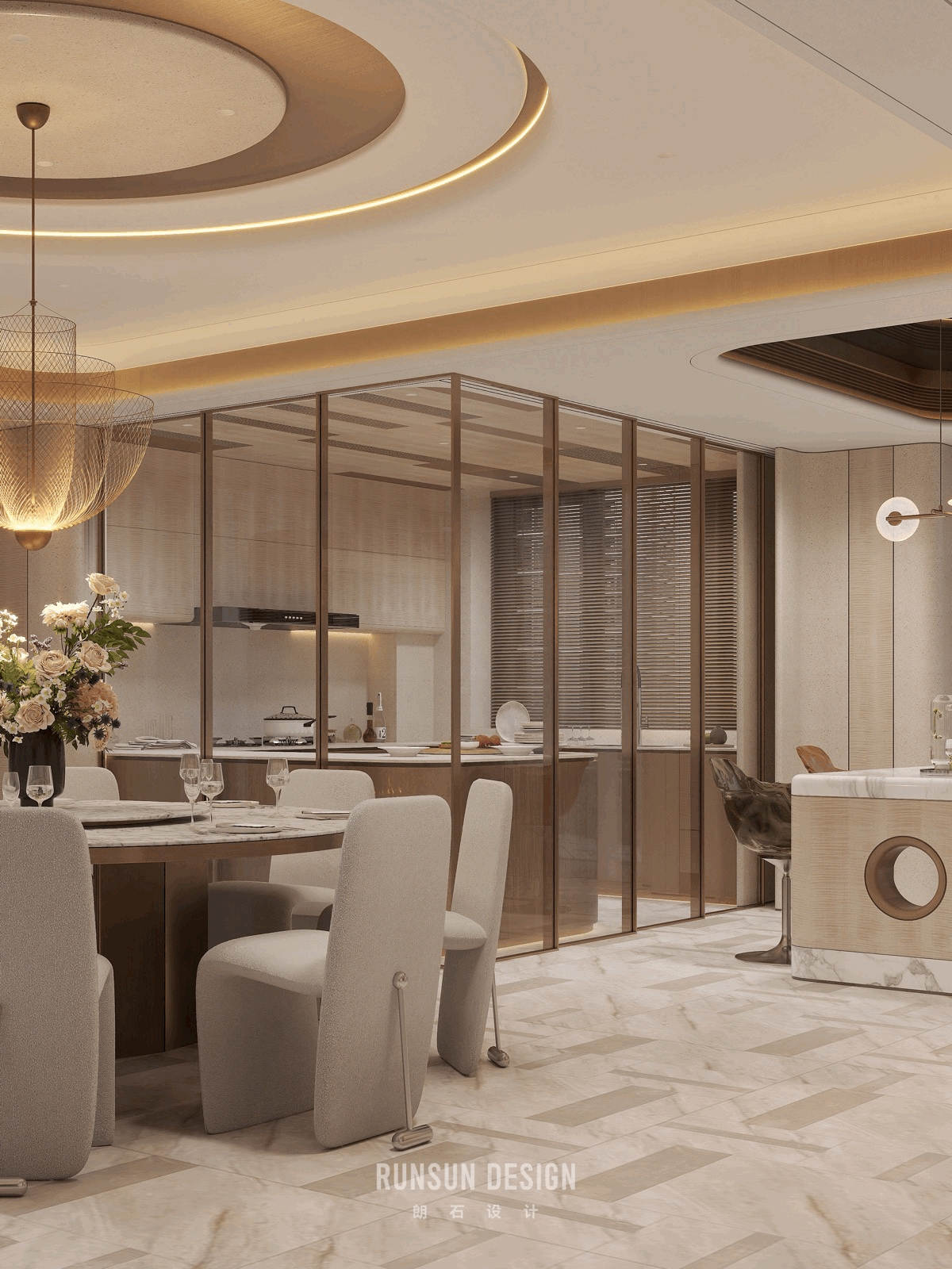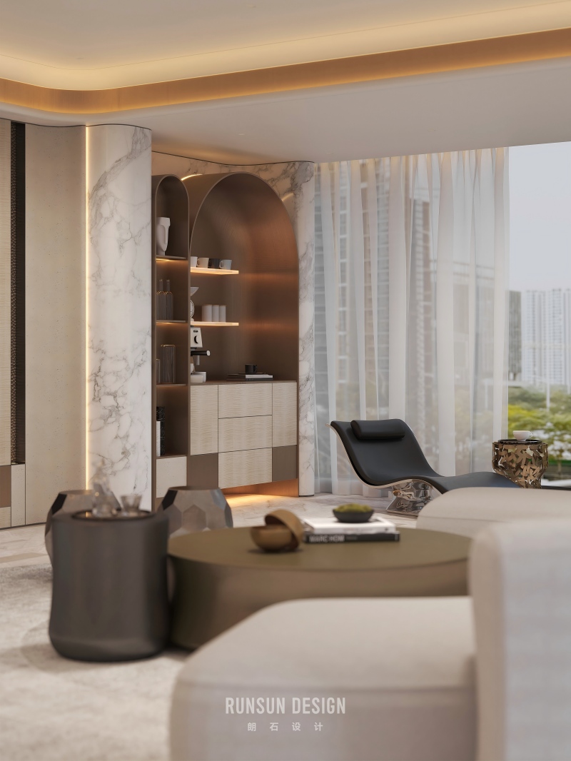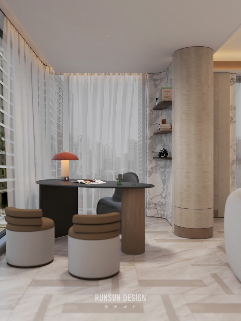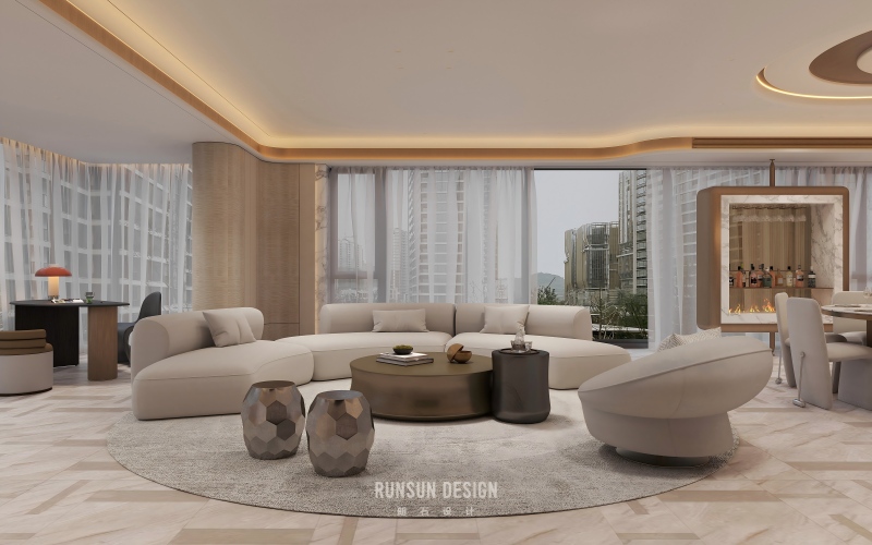巨大的落地窗將都市天際線框成一幅流動(dòng)的巨幕