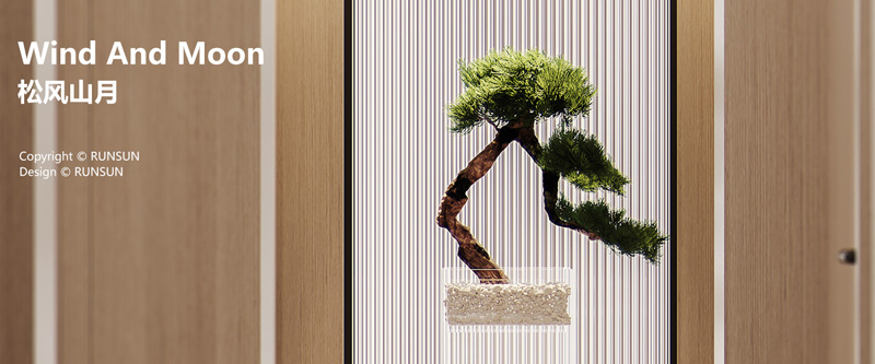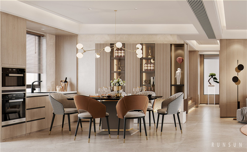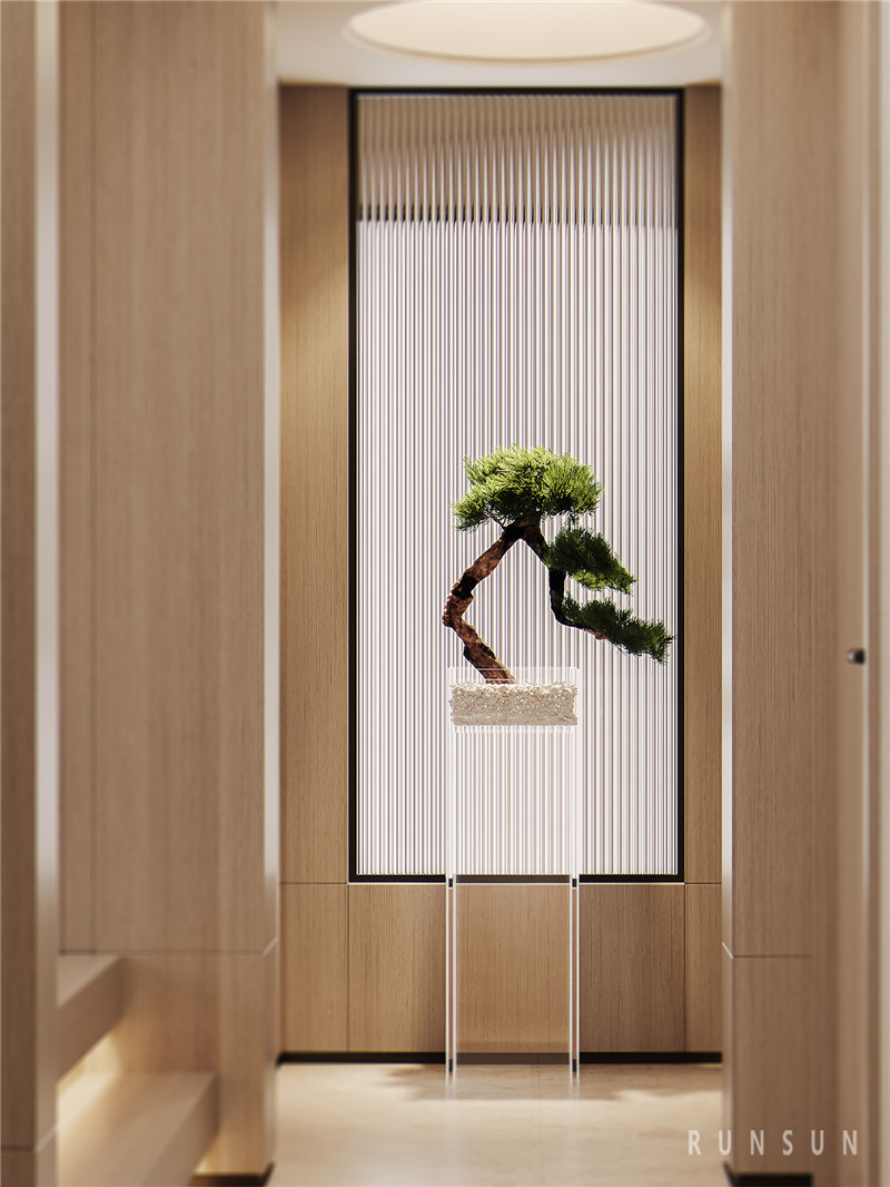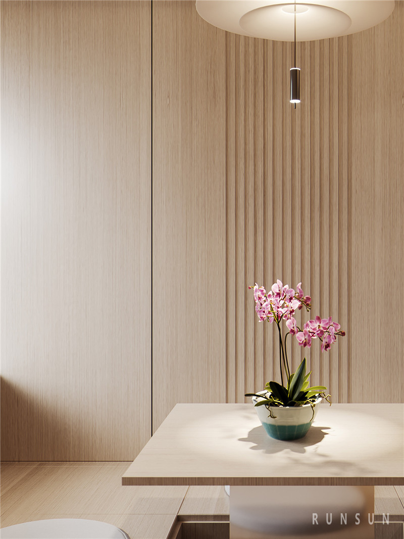 在這個空間中,我們以藝術(shù)來表征山水綿延,以人的尺度構(gòu)建賞味空間,一品、一景間,皆有意境綿長。初入空間,混合著原木紋的條形護(hù)墻出現(xiàn)在視線里,植物的輕盈加入空間的層次。中式盆景樸拙、疏落而意蘊(yùn)無窮,呼應(yīng)出業(yè)主的居家心境,駐足靜觀間仿佛延伸出這個空間之外的悠遠(yuǎn)之感。
