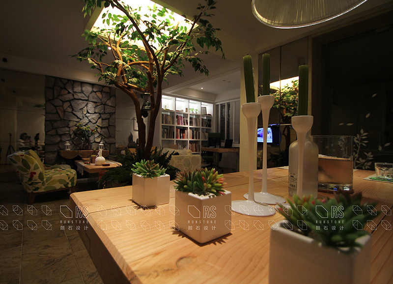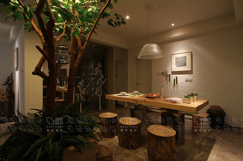 設(shè)計(jì)師在客廳與餐廳的中央為業(yè)主種下一顆蔥郁的綠樹,吊頂上的燈光,以假天井的形式表現(xiàn),瞬間將大自然的綠意引入到室內(nèi)??蛷d的茶幾,餐廳的木凳,墻上的掛臺,都是以原木樁或是原木板為原材料,剖切而成。幾塊蒲葦編制的坐墊,一堵文化石壘起的墻面,讓人瞬間覺得新意十足。