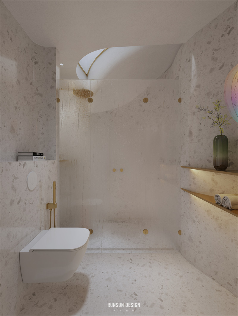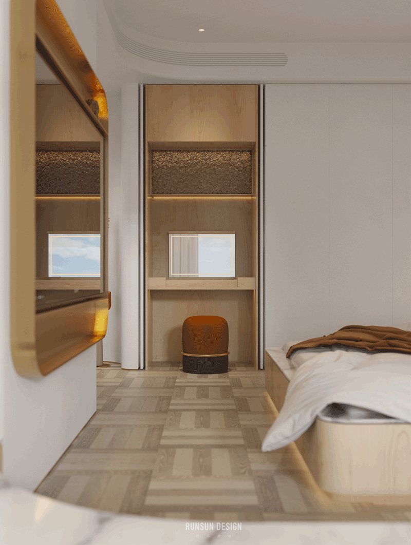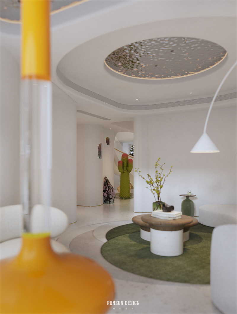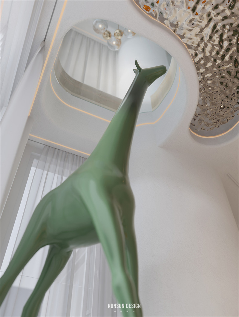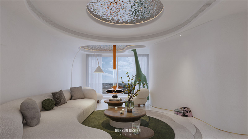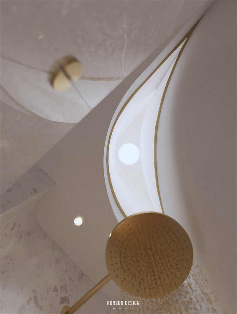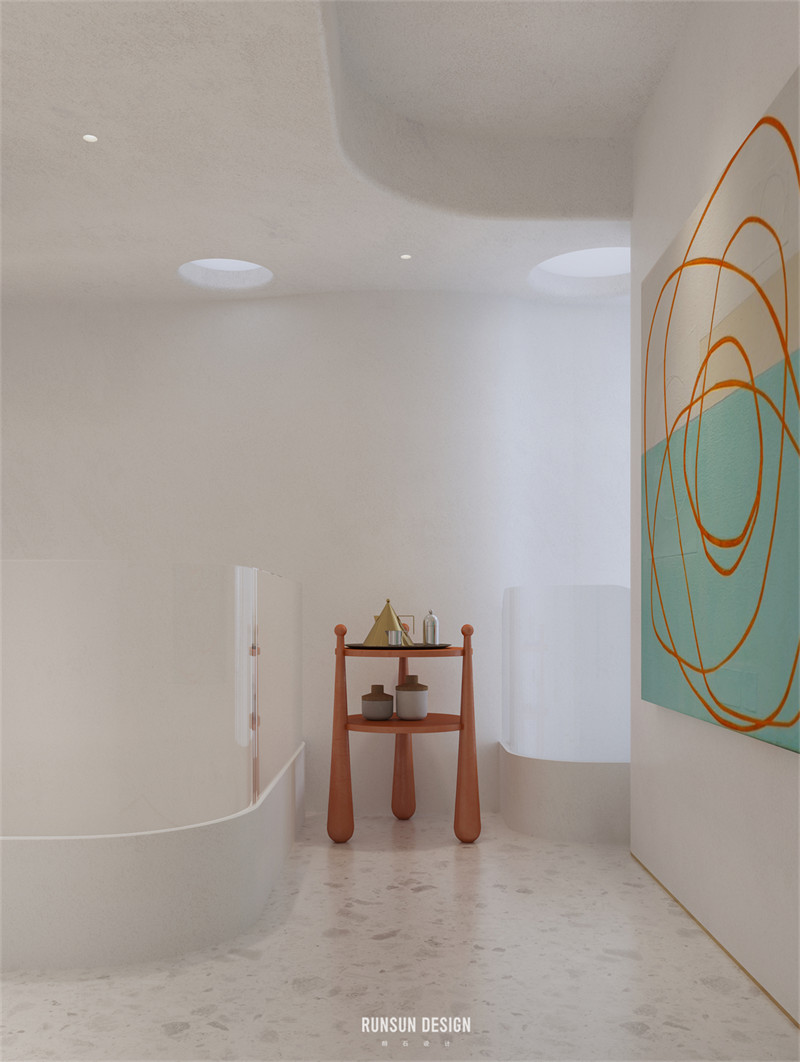 我們用不規(guī)則的形狀去定義這個家。讓本來方正的空間變得圓潤,適宜居住。它同時也具有了鮮活的表現(xiàn)力與藝術(shù)色彩。或許它是某種意義上的“La Pedrera”——吊頂與墻壁上異型空間穿透總讓我們聯(lián)想起那些在巴塞羅那的藝術(shù)建筑。