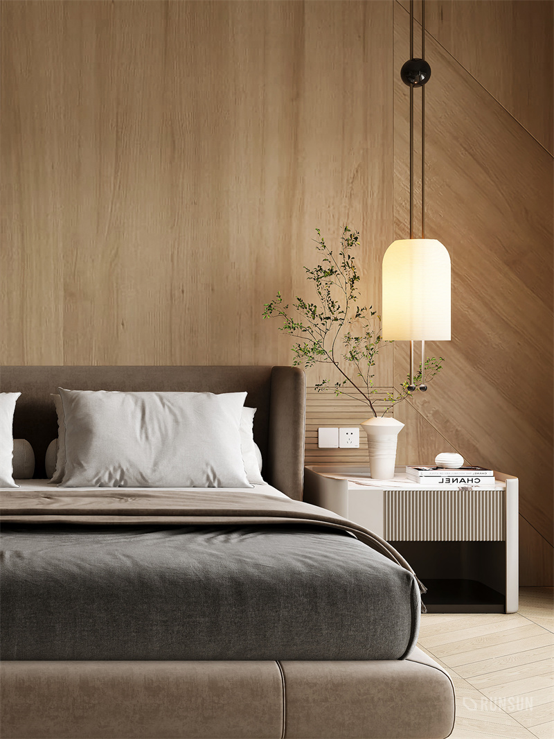 床頭的斜拼木飾面