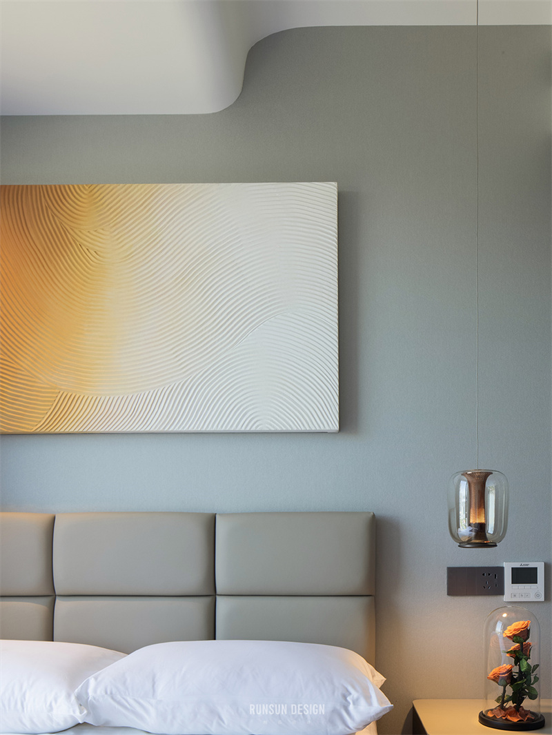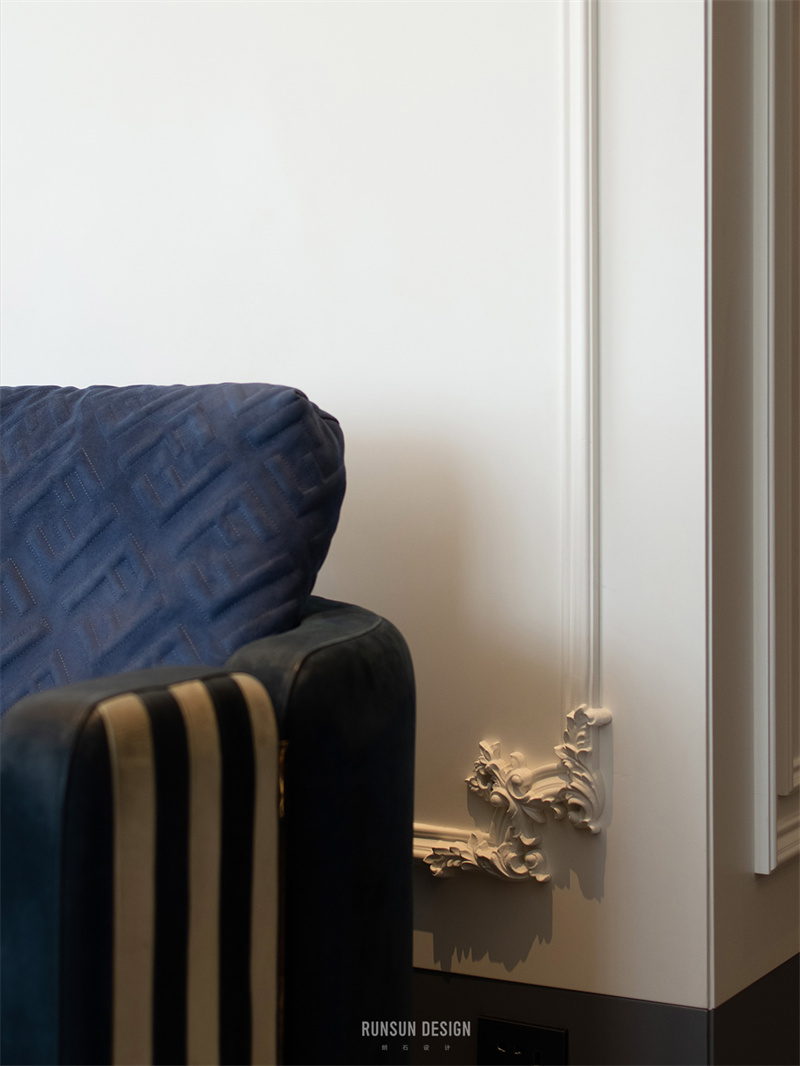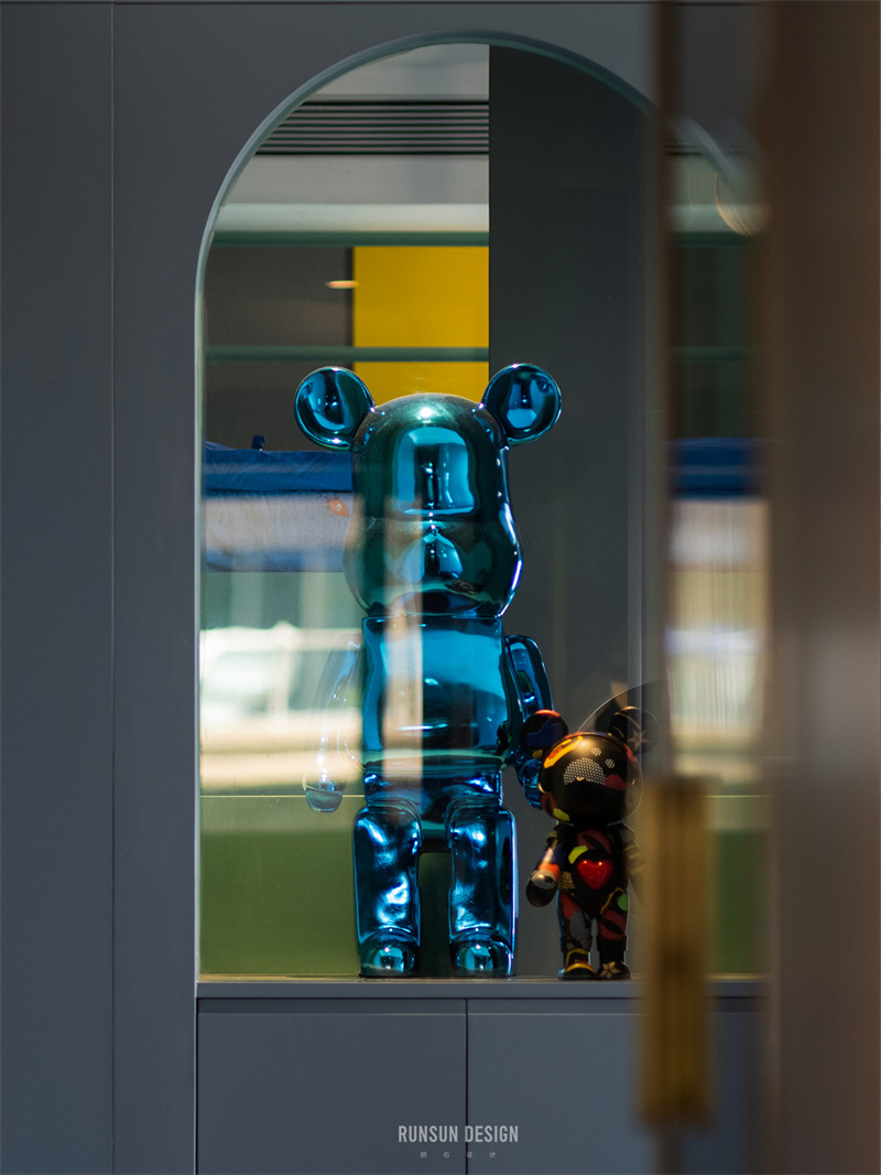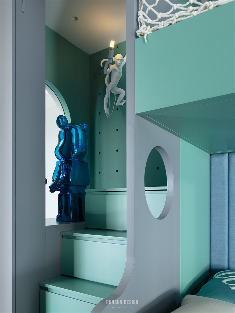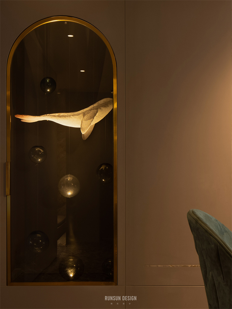 空間中我們打造了一個(gè)非常有趣的小孩房。為了將這種趣味氤氳至全屋,我們還做了很多特殊的設(shè)計(jì)。比如玄關(guān)處我們?cè)O(shè)計(jì)了鯨魚的藝術(shù)裝置。將“林深時(shí)見鹿,海藍(lán)時(shí)見鯨”的夢幻氣息也引入這個(gè)空間中。