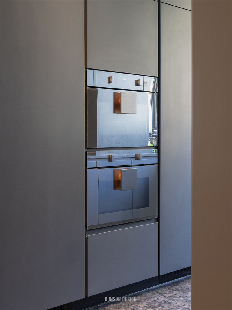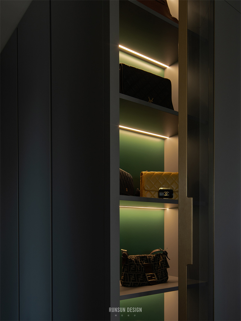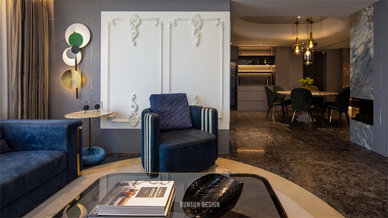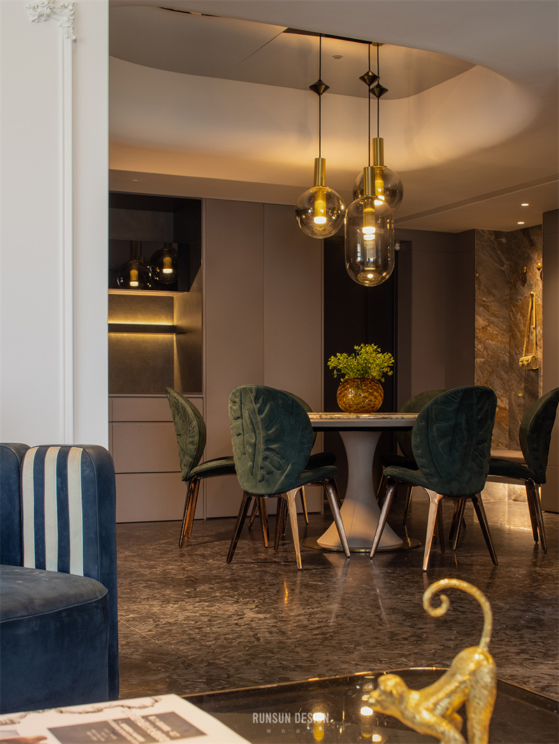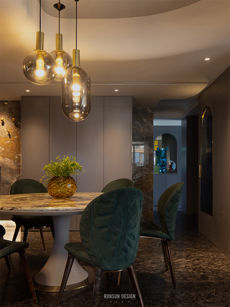 空間中我們打造了一個(gè)非常有趣的小孩房。為了將這種趣味氤氳至全屋,我們還做了很多特殊的設(shè)計(jì)。比如玄關(guān)處我們?cè)O(shè)計(jì)了鯨魚的藝術(shù)裝置。將“林深時(shí)見鹿,海藍(lán)時(shí)見鯨”的夢幻氣息也引入這個(gè)空間中。