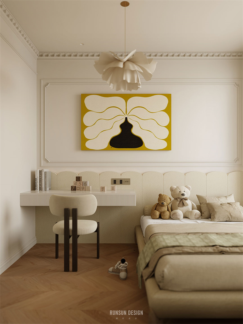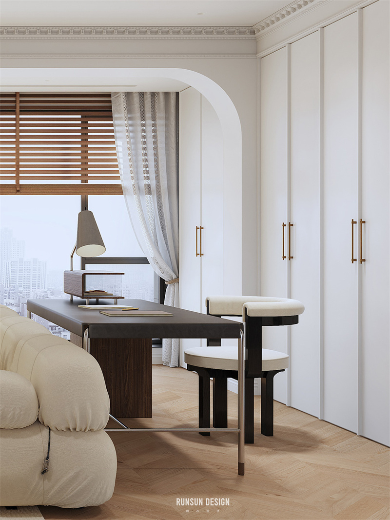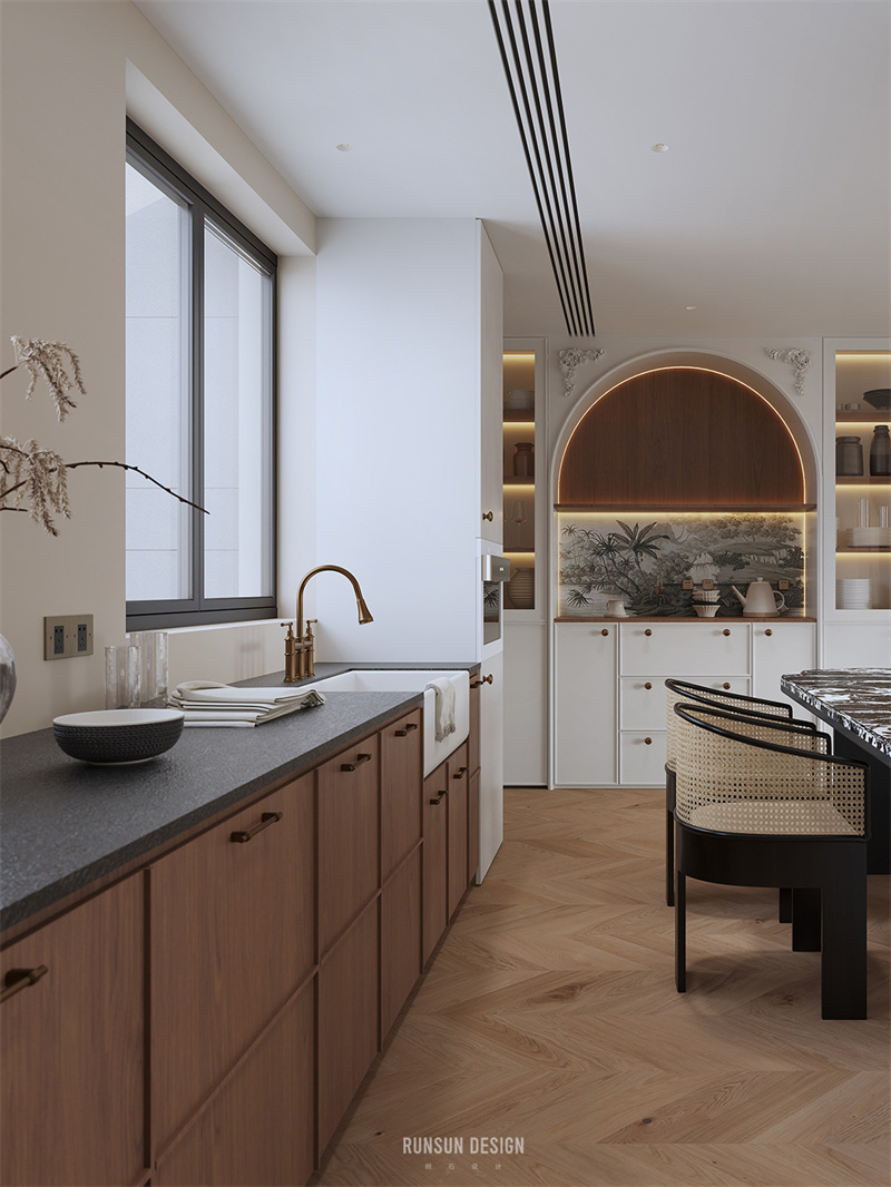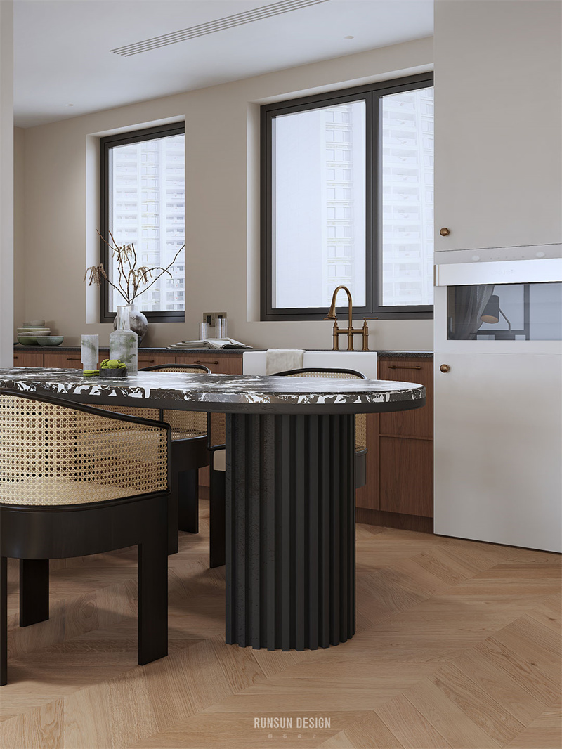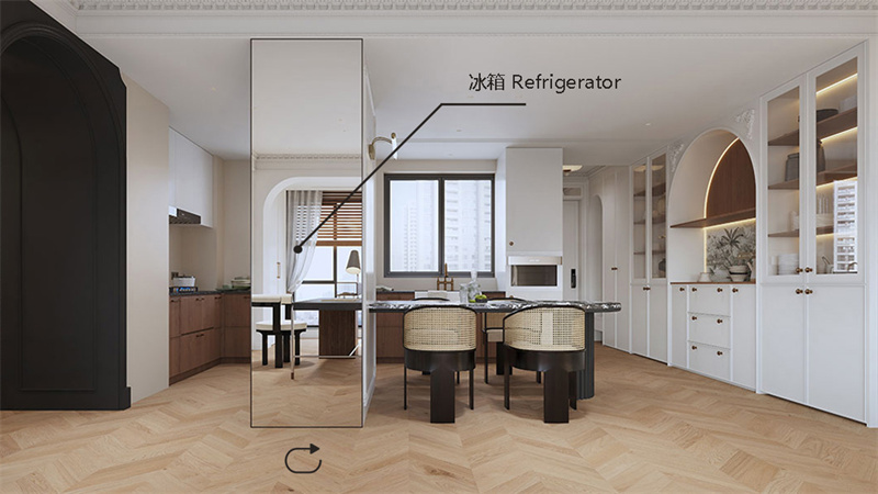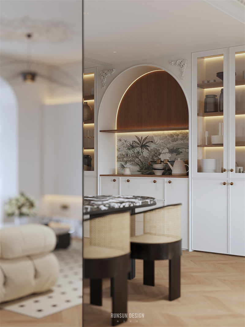 怎么能既擁有美觀開放式廚房,又擁有合理的廚房操作動(dòng)線?本案將冰箱放置在餐廳中間,完美融合風(fēng)格的同時(shí),形成了便于操作與行走的洄游動(dòng)線,使得這個(gè)空間靈動(dòng)自然,妙趣橫生。全屋以春之葳蕤為主題,云霞羨慕她的衣裳,鮮花想要她的容顏,春風(fēng)吹拂著欄桿,花上的露珠都是那么濃盛。