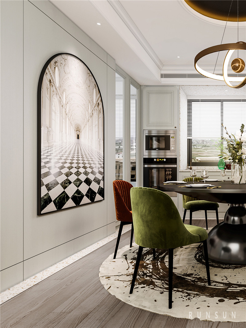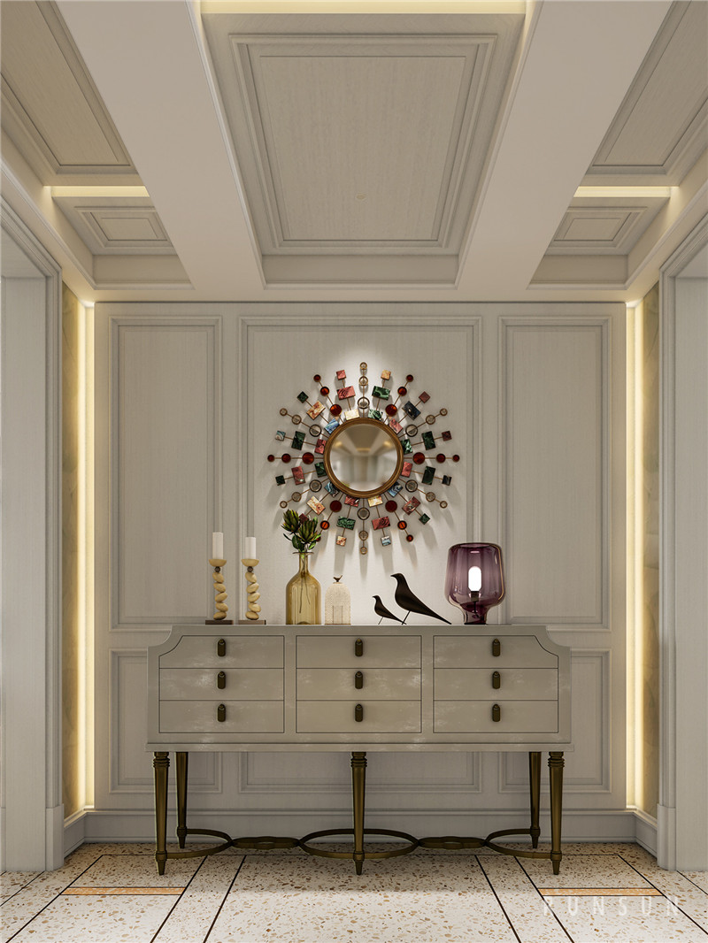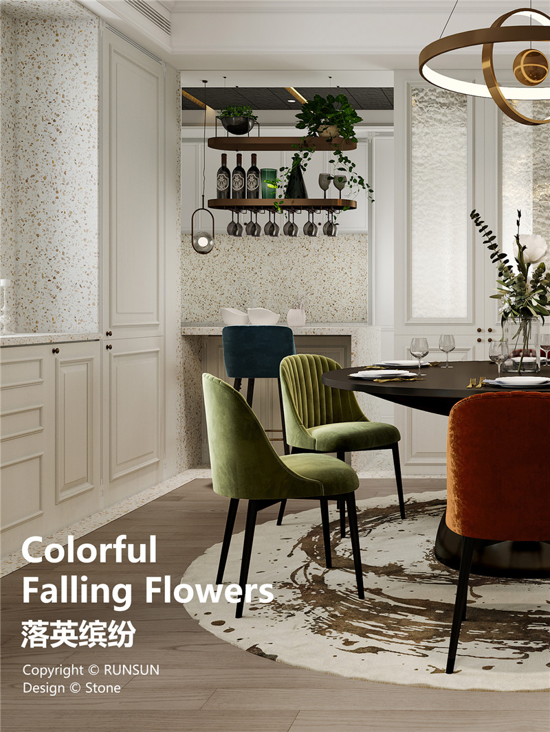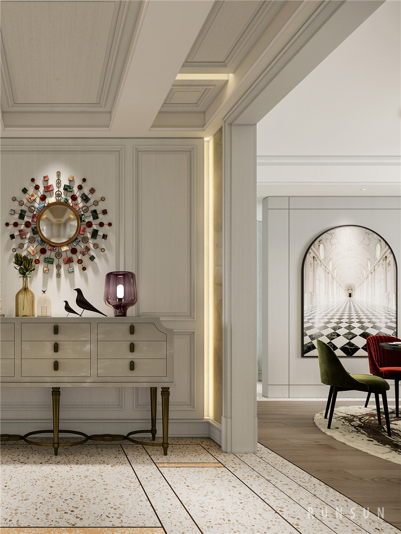 我們將古老元素與新時(shí)代的美式元素混搭融合,做一次前所未有的嘗試,便出現(xiàn)了《落英繽紛》這套作品。這套案例中除了經(jīng)典的美式護(hù)墻外,我們將水磨石材料做了新的運(yùn)用,構(gòu)造玄關(guān)地面與整個(gè)主衛(wèi)生間,材料中的斑斑點(diǎn)點(diǎn)如落花一樣點(diǎn)綴在其中,優(yōu)雅而柔美。經(jīng)典而不拘泥形態(tài)的意式家具為經(jīng)典美式墻裙與古老水磨石最了最好的中和,步入這個(gè)空間仿佛走進(jìn)了另一個(gè)桃花源。