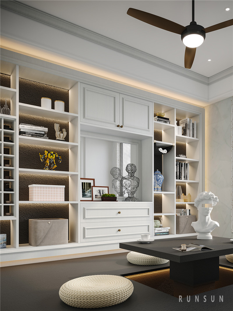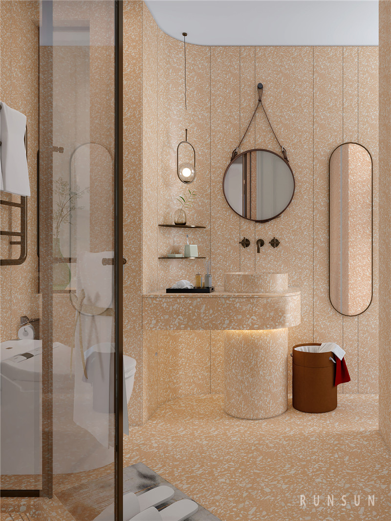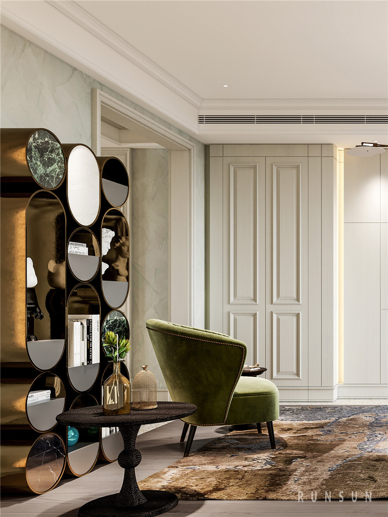 We have completed this set of works by combining the ancient elements with the American elements.We have made a new use of terrazzo materials to construct the floor of the porch and the whole main bathroom. The spots in the materials are dotted like falling flowers.Italian furniture makes the best balance between American wainscot and terrazzo, as if entering another world.