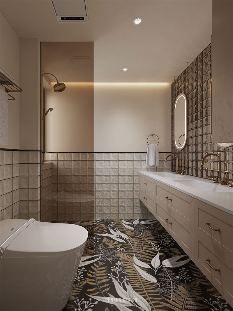 一道夢(mèng)幻的玻璃墻將主臥與主衛(wèi)隔斷