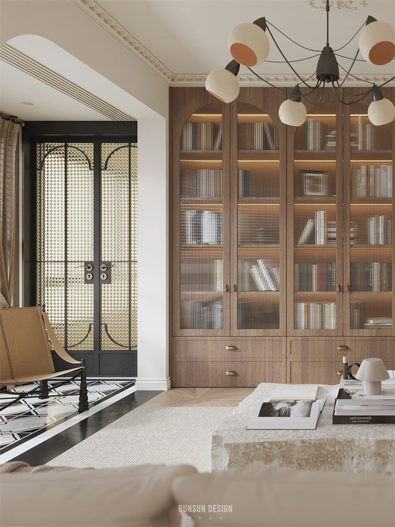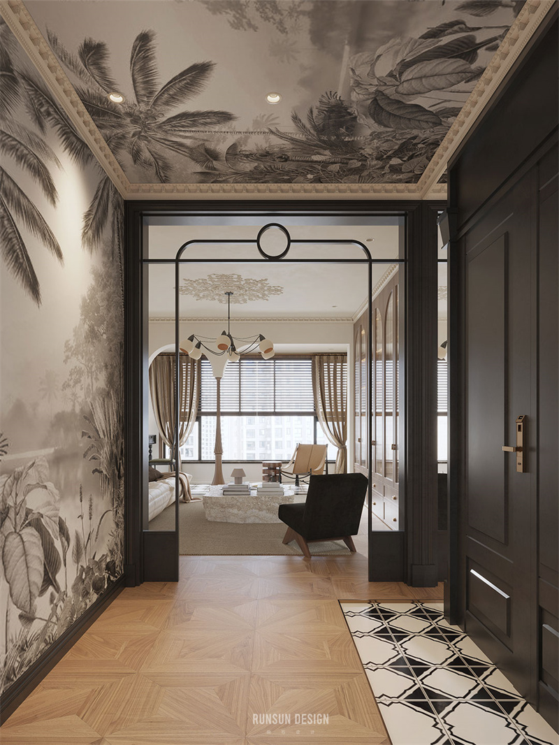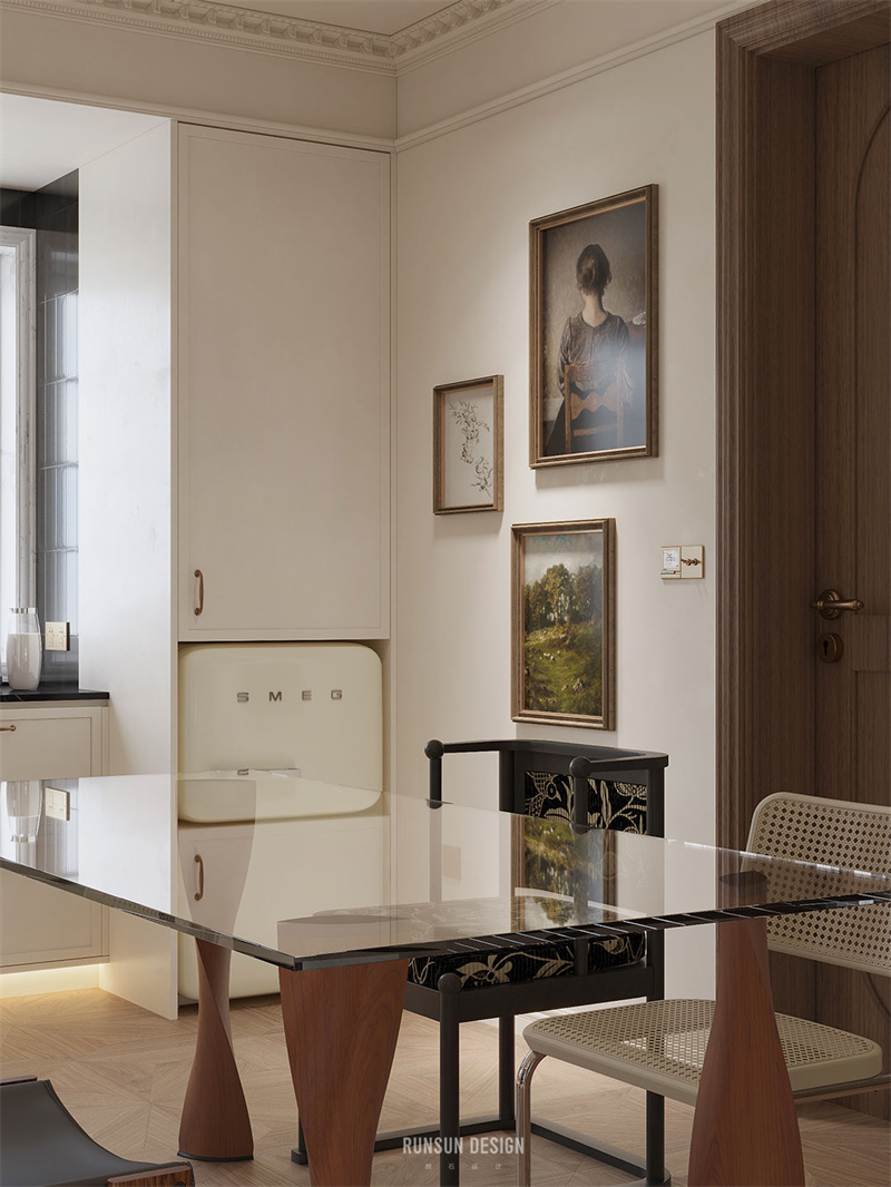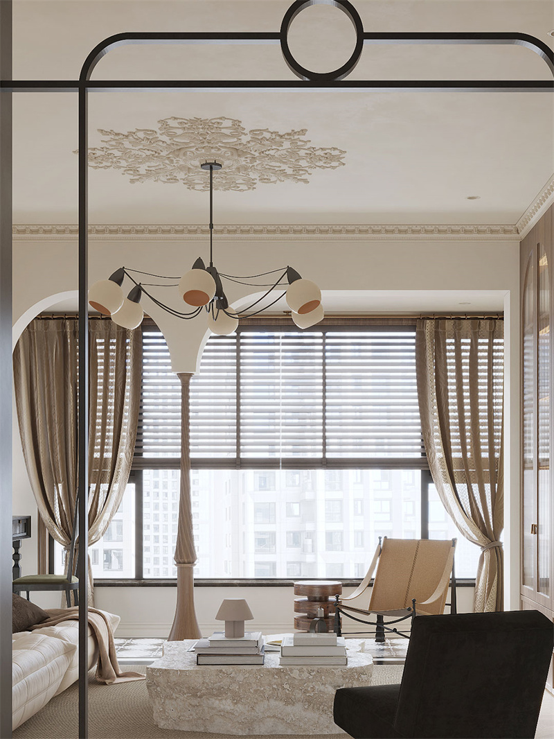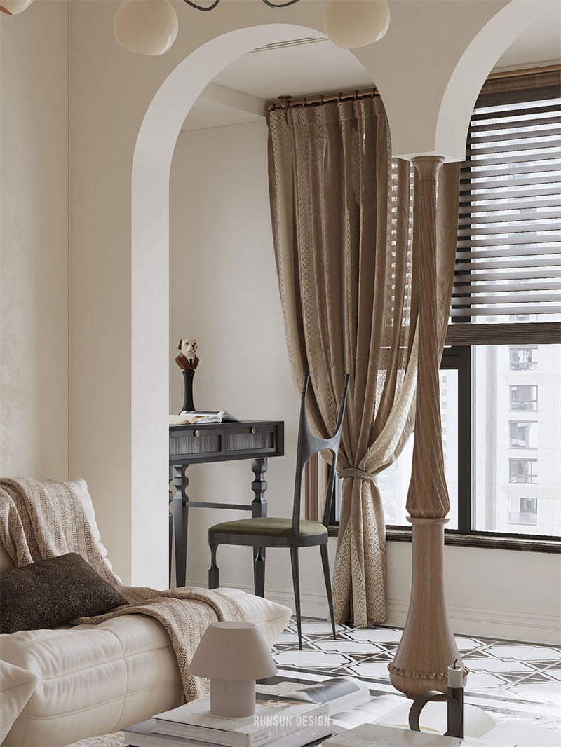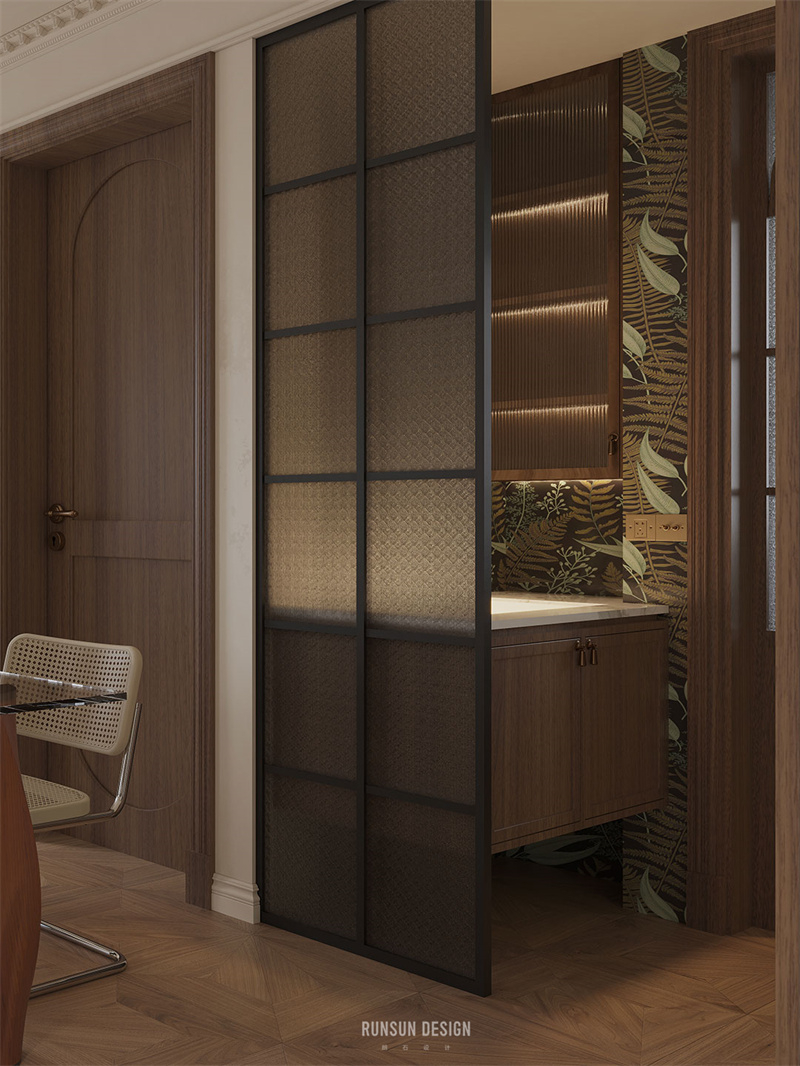 《夜間的露天咖啡座》描繪的南法風(fēng)情令人神往,那是邊臨室內(nèi)與室外的一種浪漫。本案引入法式窗景陽(yáng)臺(tái)的概念,在室內(nèi)通過(guò)藝術(shù)玻璃與造型門洞的結(jié)合,打造多個(gè)類似室內(nèi)與室外邊臨的隔斷,通過(guò)這些隔斷層層遞進(jìn),仿佛打開(kāi)窗戶步入一個(gè)個(gè)浪漫的世界。