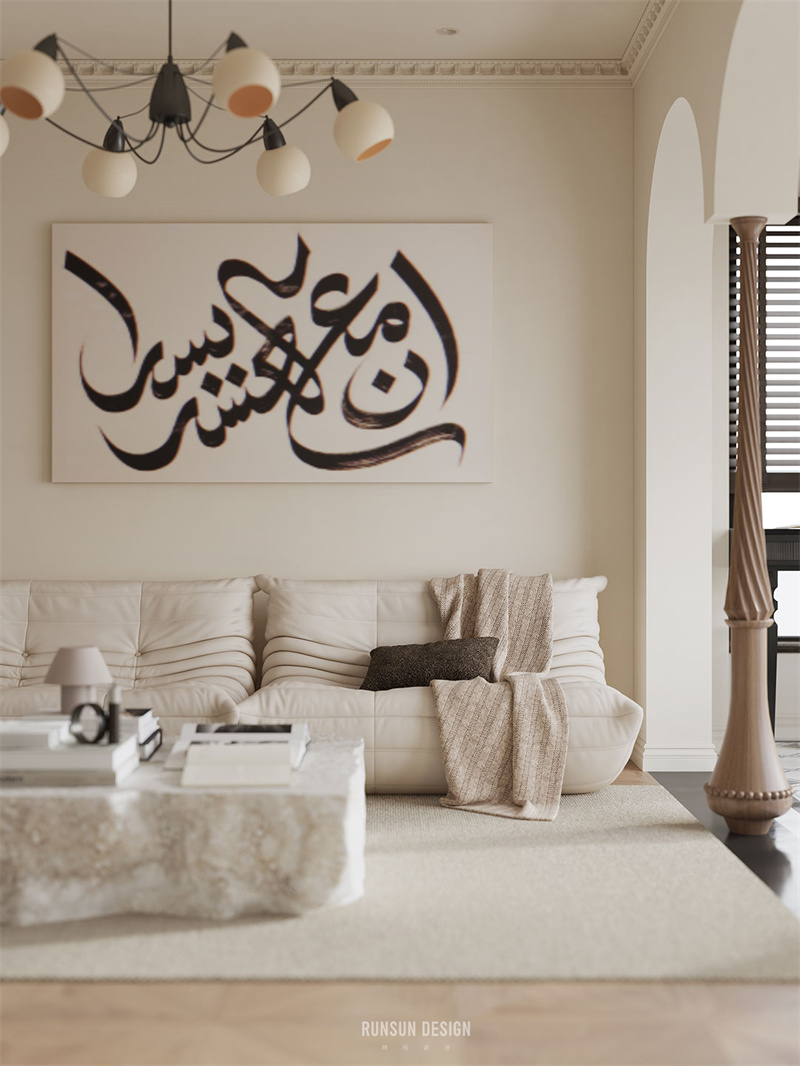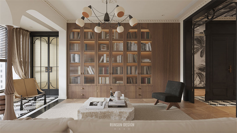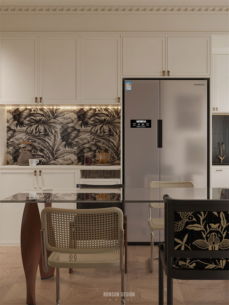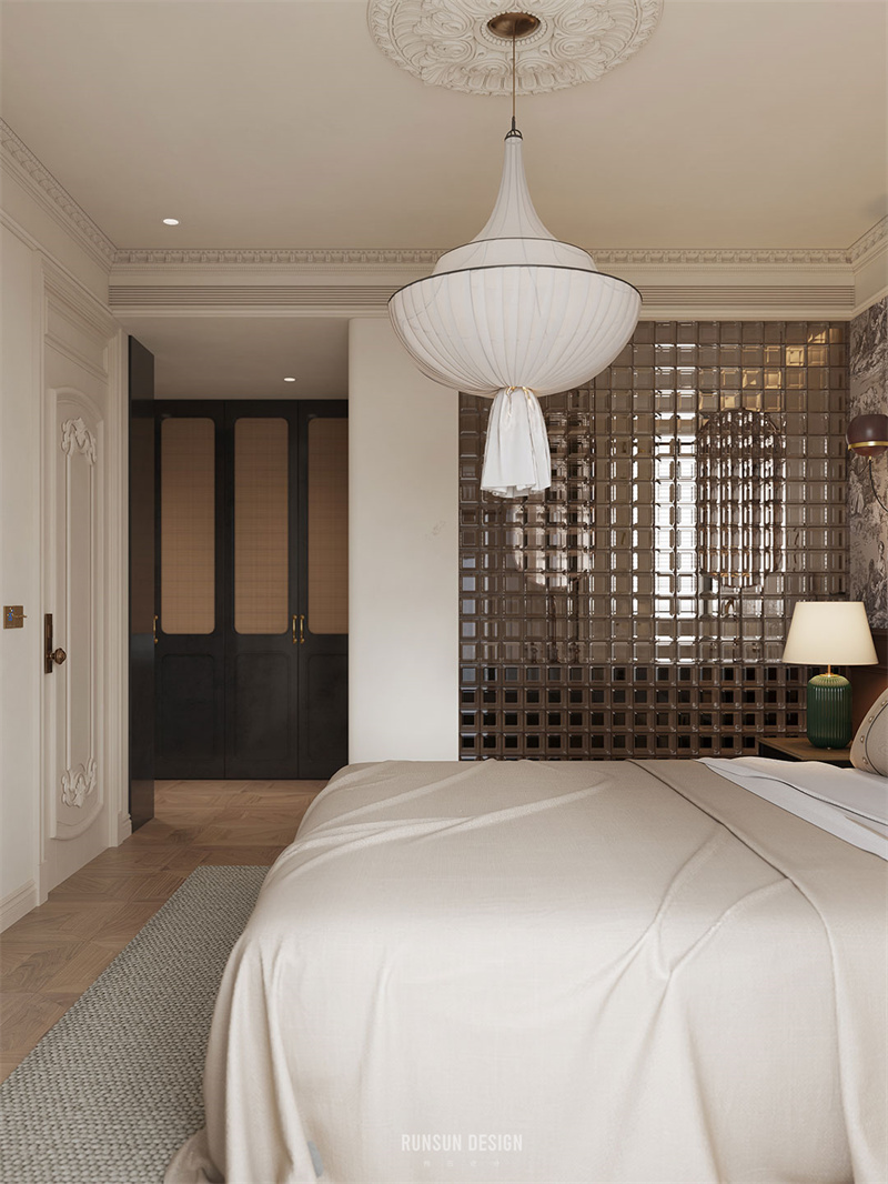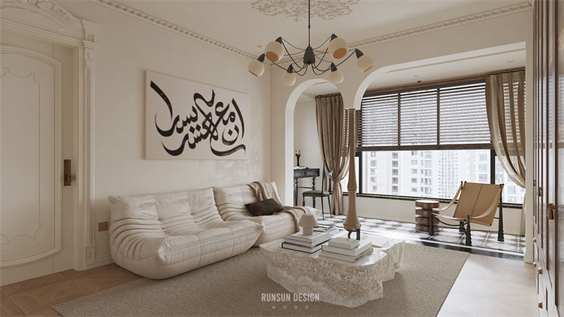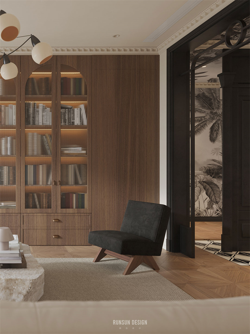 《夜間的露天咖啡座》描繪的南法風(fēng)情令人神往,那是邊臨室內(nèi)與室外的一種浪漫。本案引入法式窗景陽(yáng)臺(tái)的概念,在室內(nèi)通過(guò)藝術(shù)玻璃與造型門洞的結(jié)合,打造多個(gè)類似室內(nèi)與室外邊臨的隔斷,通過(guò)這些隔斷層層遞進(jìn),仿佛打開(kāi)窗戶步入一個(gè)個(gè)浪漫的世界。