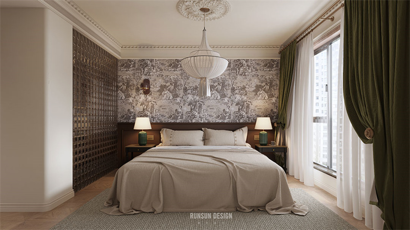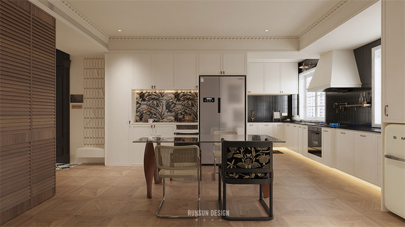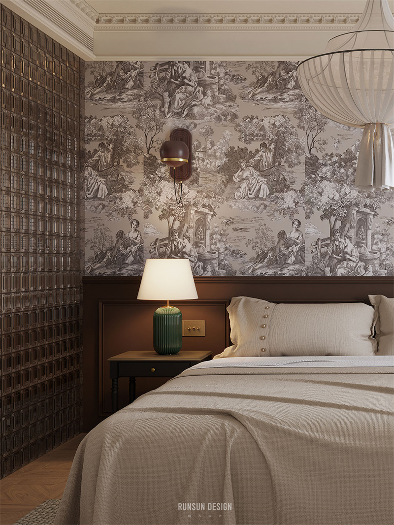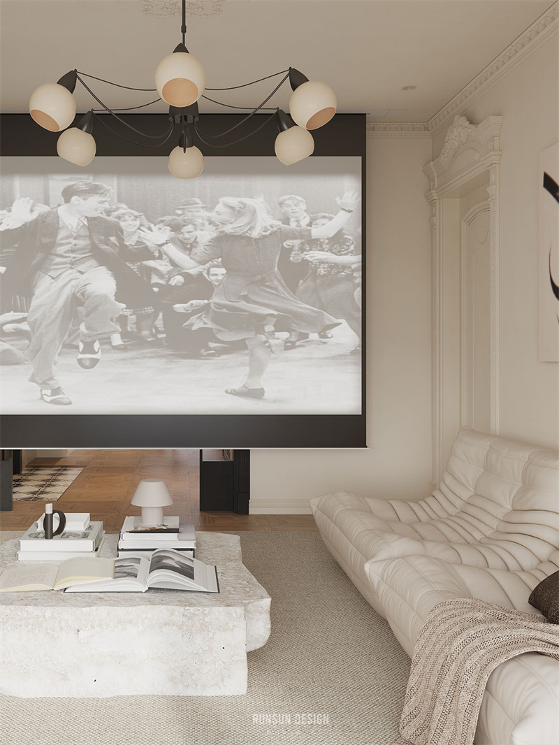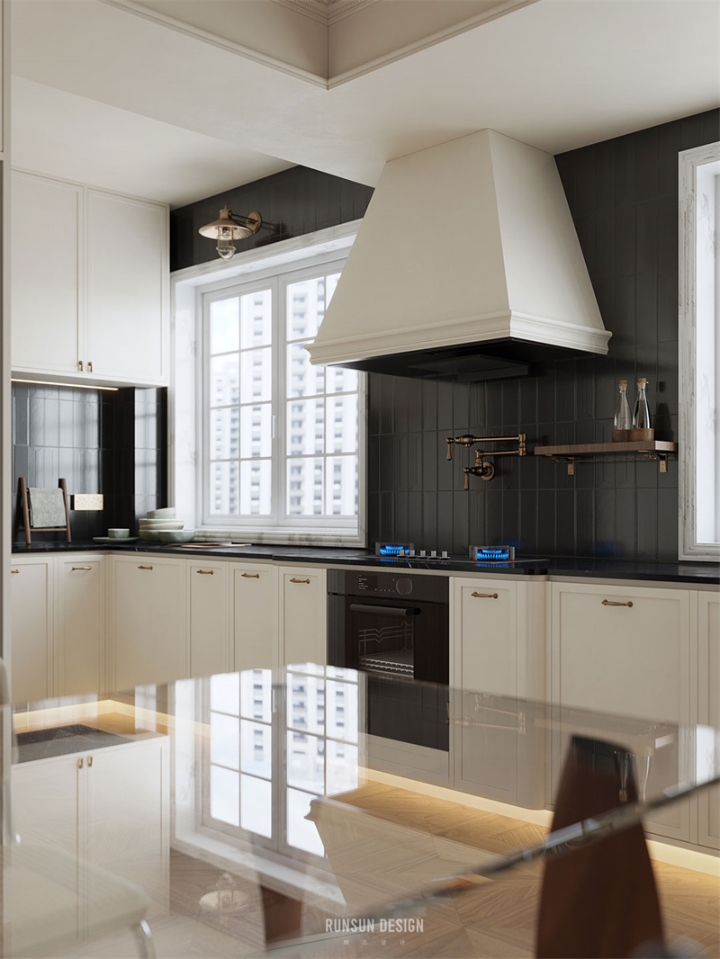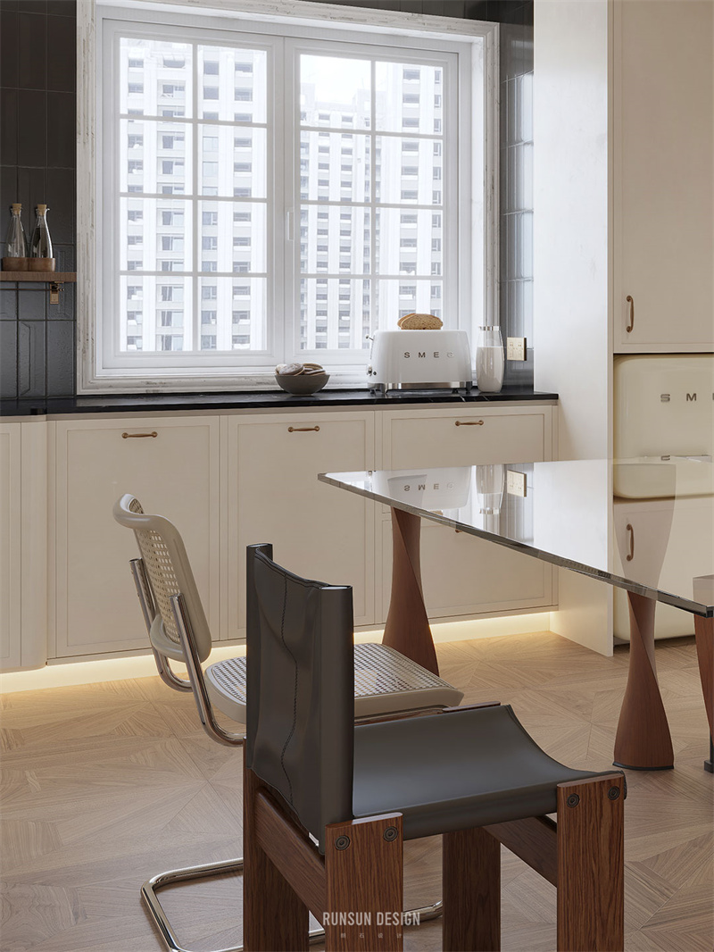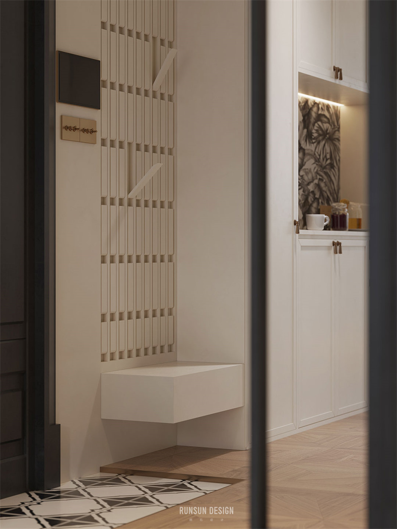 《夜間的露天咖啡座》描繪的南法風(fēng)情令人神往,那是邊臨室內(nèi)與室外的一種浪漫。本案引入法式窗景陽(yáng)臺(tái)的概念,在室內(nèi)通過(guò)藝術(shù)玻璃與造型門洞的結(jié)合,打造多個(gè)類似室內(nèi)與室外邊臨的隔斷,通過(guò)這些隔斷層層遞進(jìn),仿佛打開(kāi)窗戶步入一個(gè)個(gè)浪漫的世界。