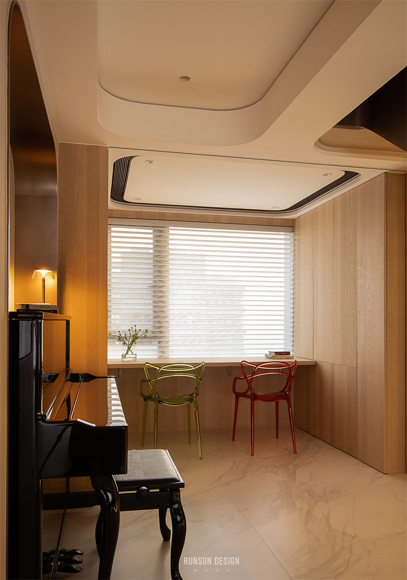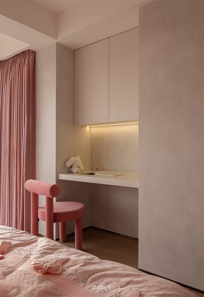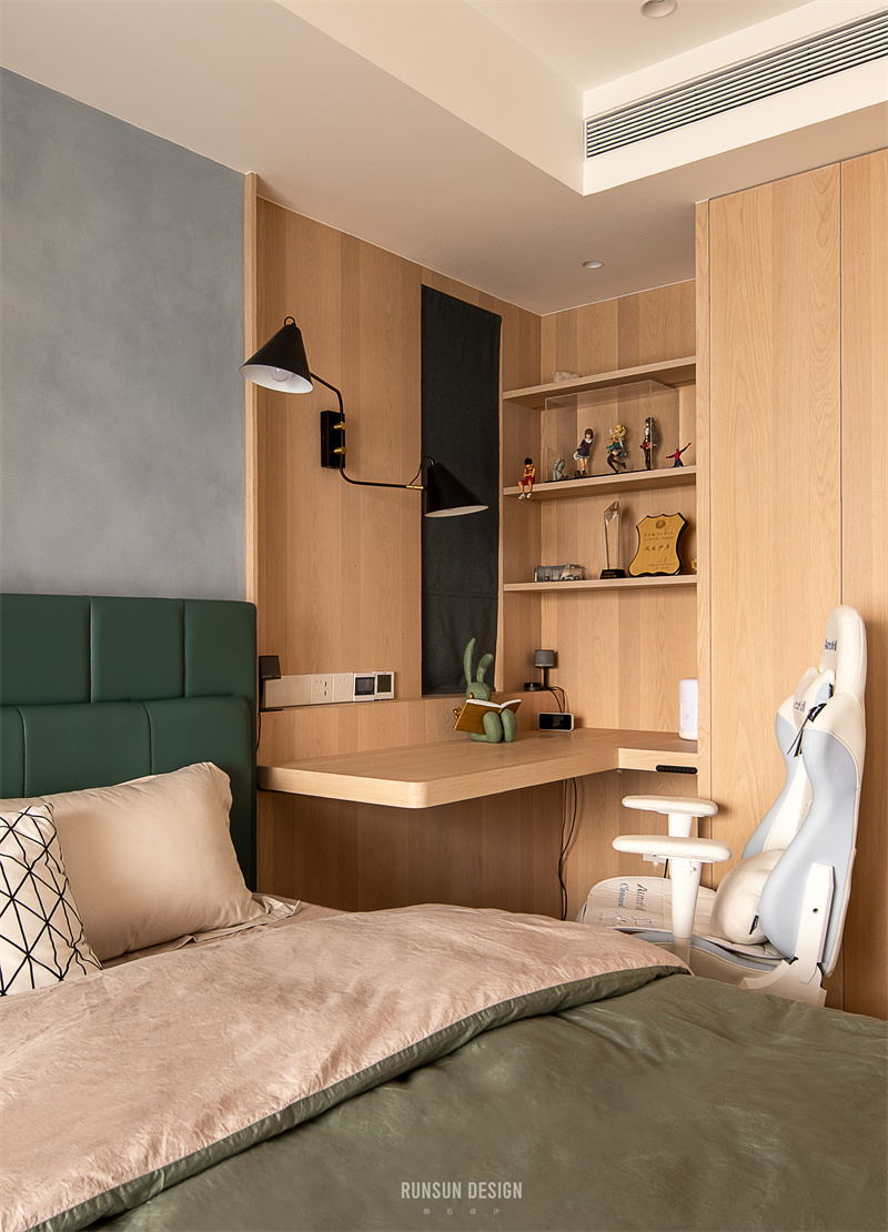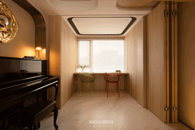 這是一個多功能書房的設(shè)計。我們在書房設(shè)置一個可開合的折疊門,形成一個既可開放又可密閉的學(xué)習(xí)辦公空間。書房的桌面是可以活動下翻的。當(dāng)桌面收起時,可以將隱藏在右側(cè)柜體內(nèi)的折疊床拉出,形成一個多功能的客房。