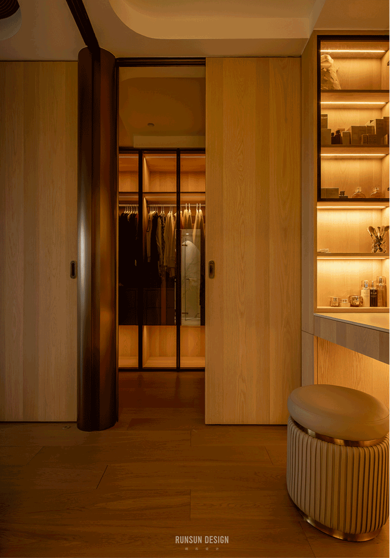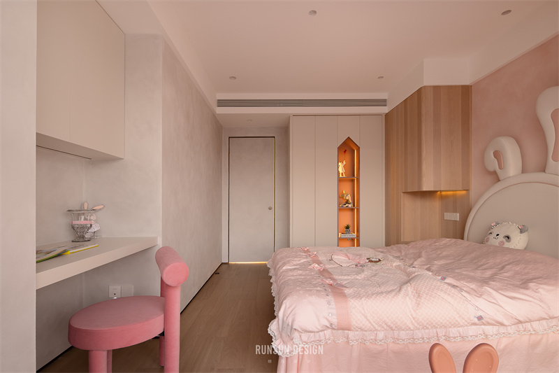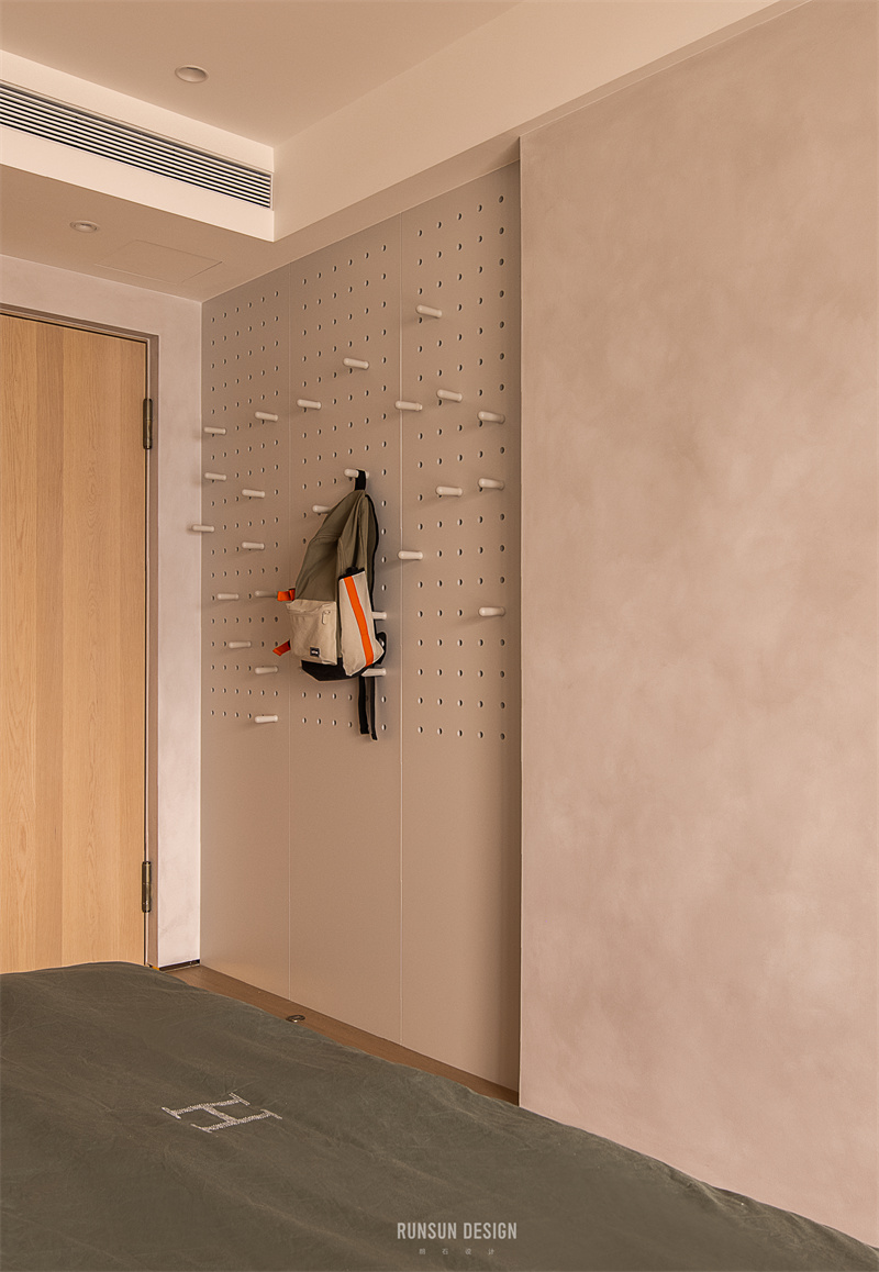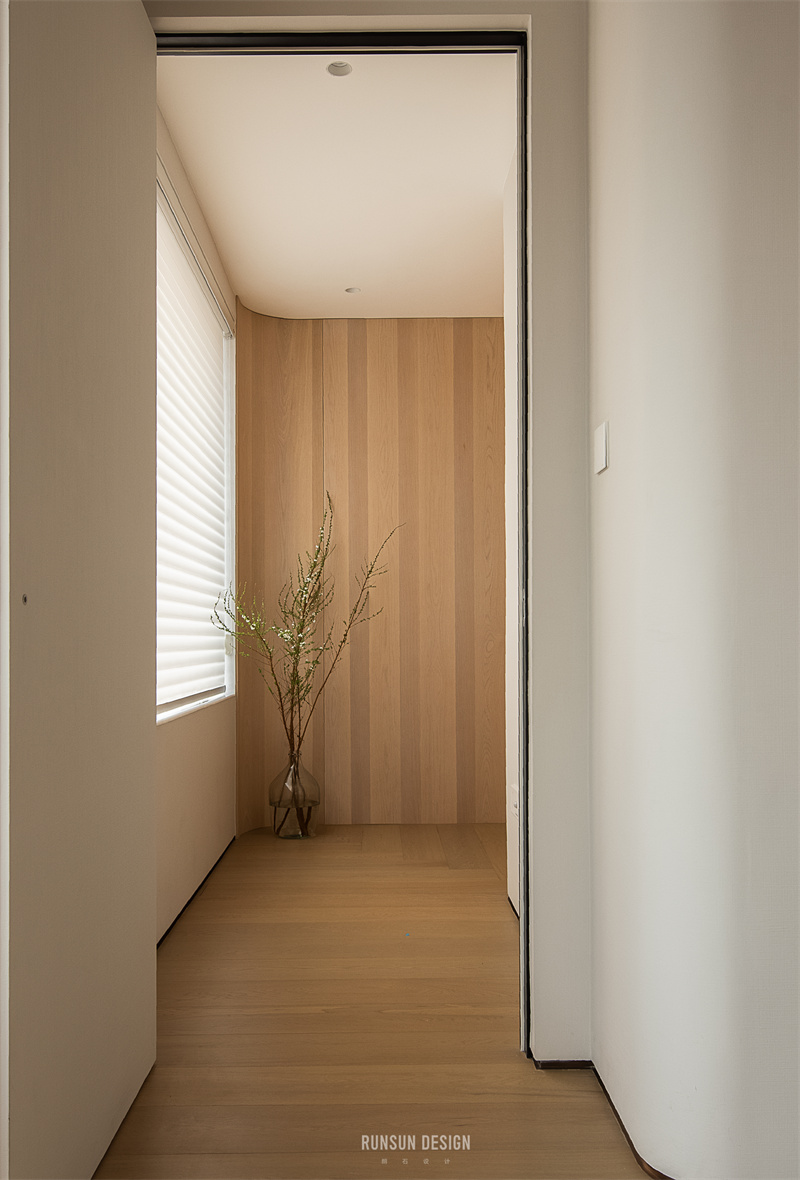 這是一個多功能書房的設(shè)計。我們在書房設(shè)置一個可開合的折疊門,形成一個既可開放又可密閉的學(xué)習(xí)辦公空間。書房的桌面是可以活動下翻的。當(dāng)桌面收起時,可以將隱藏在右側(cè)柜體內(nèi)的折疊床拉出,形成一個多功能的客房。