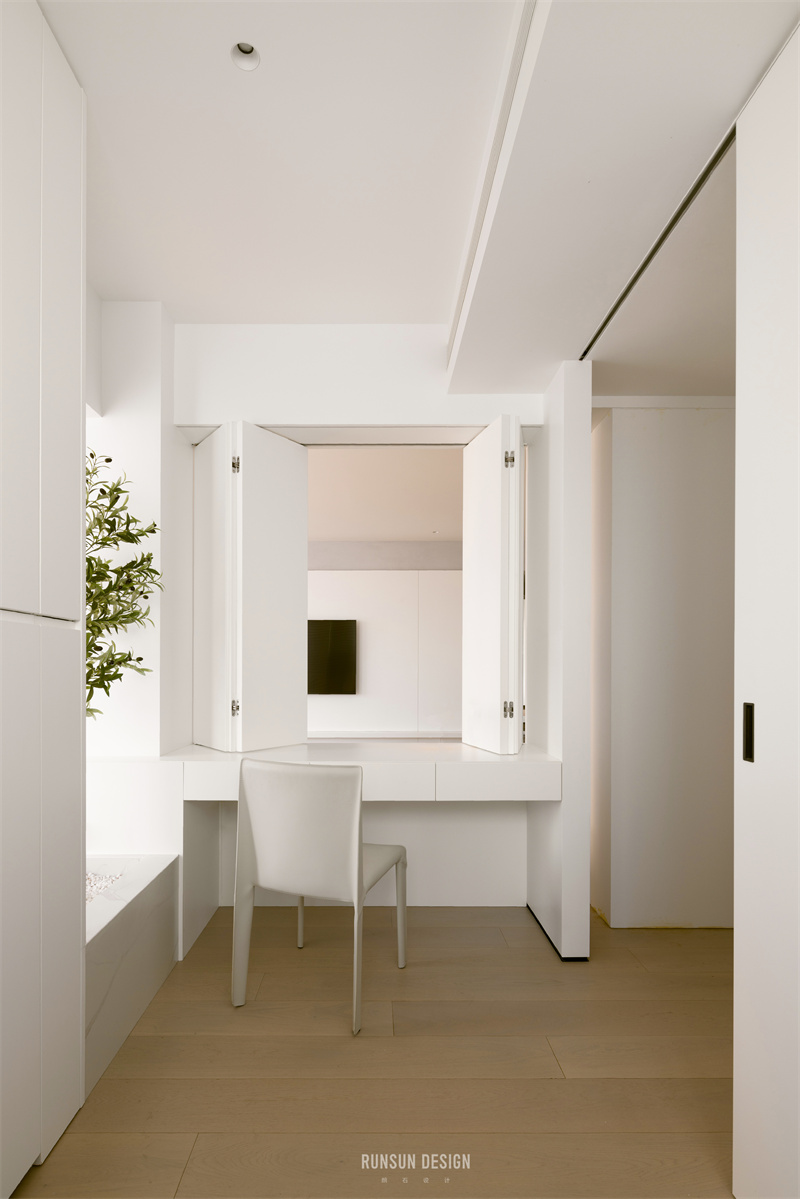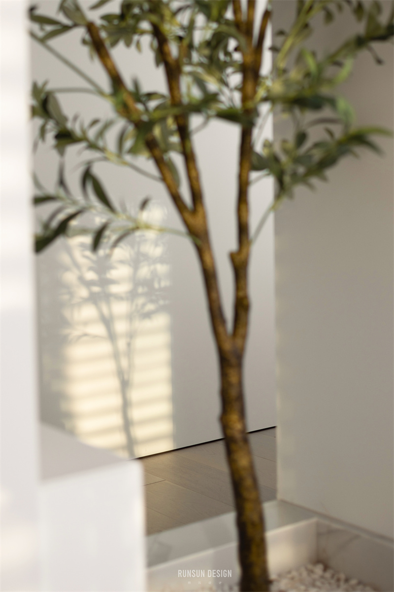 業(yè)主需要一個詩意的書房,我們通過現(xiàn)場觀測及陽光模擬,在榻榻米與書房隔斷間設(shè)計綠植端景,通過陽光將綽約的樹影投射在書房里,創(chuàng)造一個詩意的讀書環(huán)境。