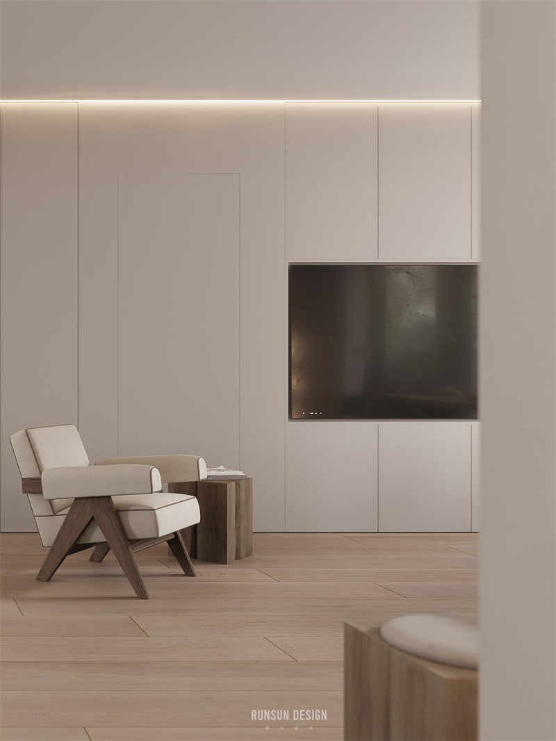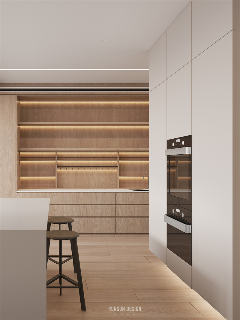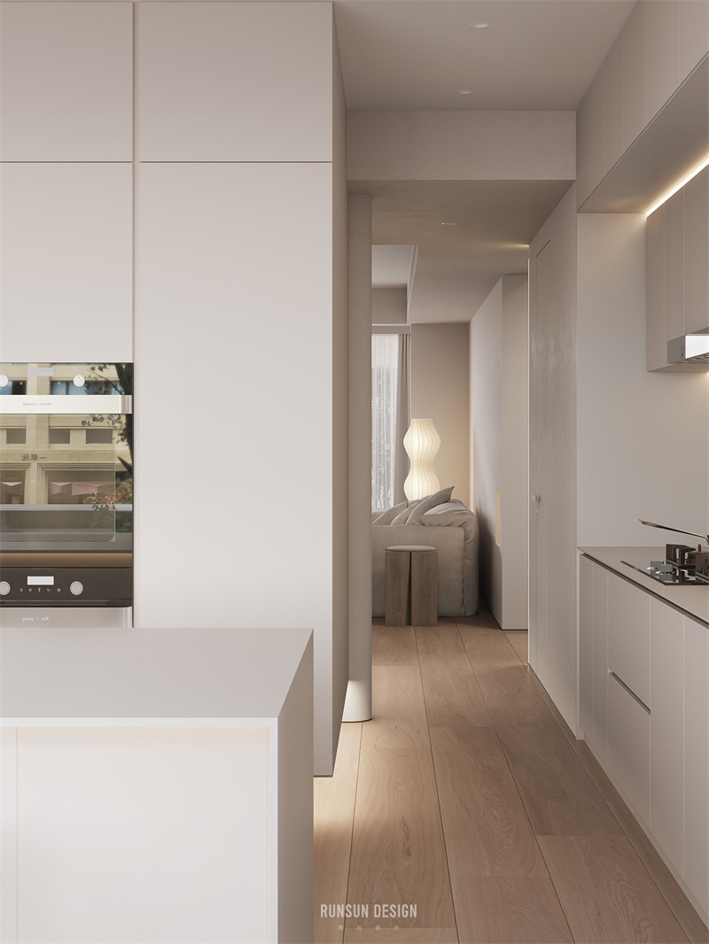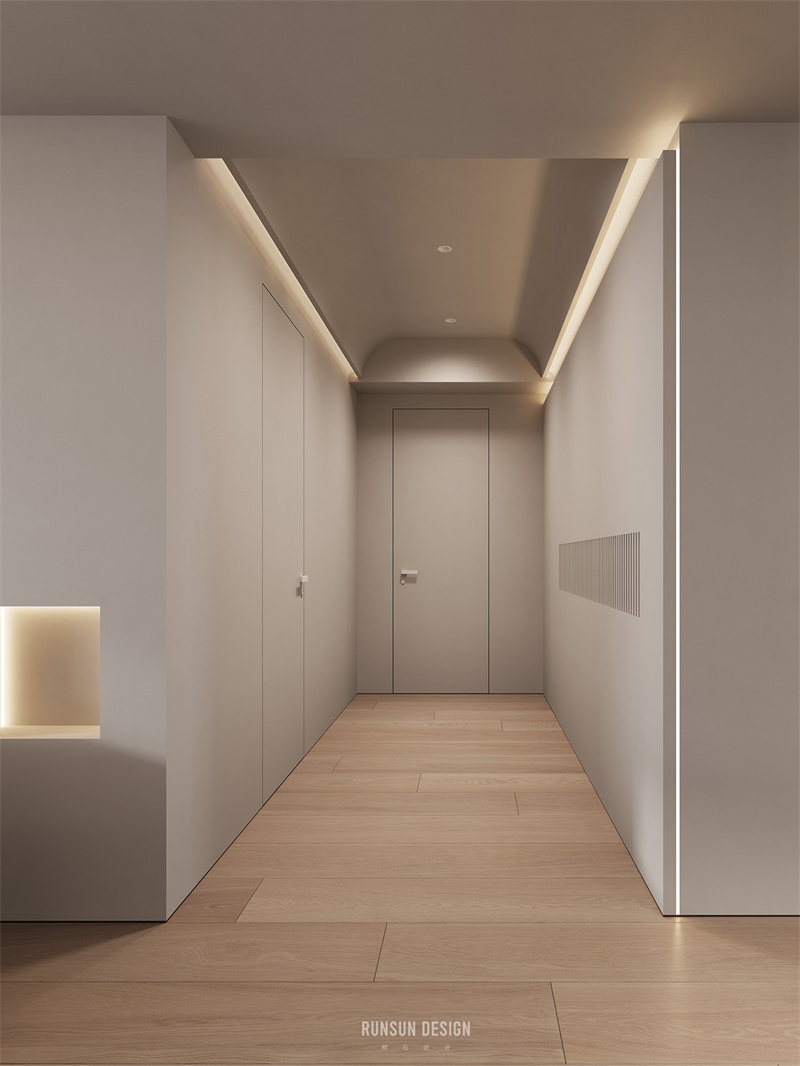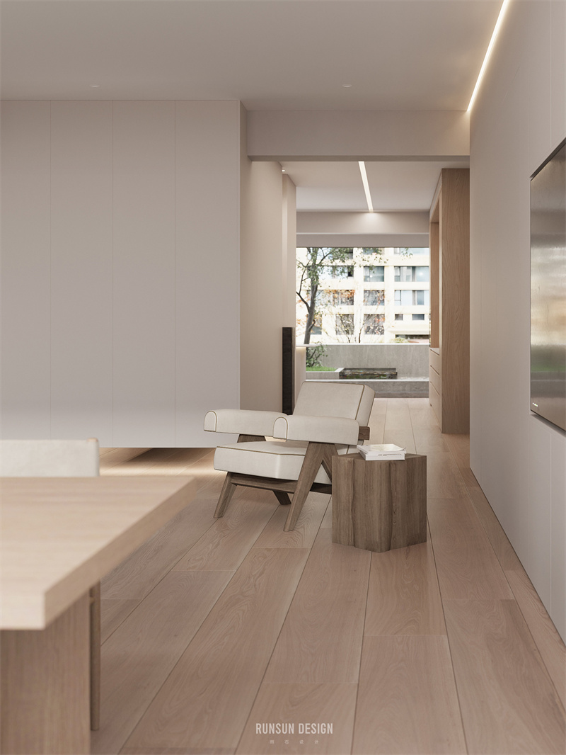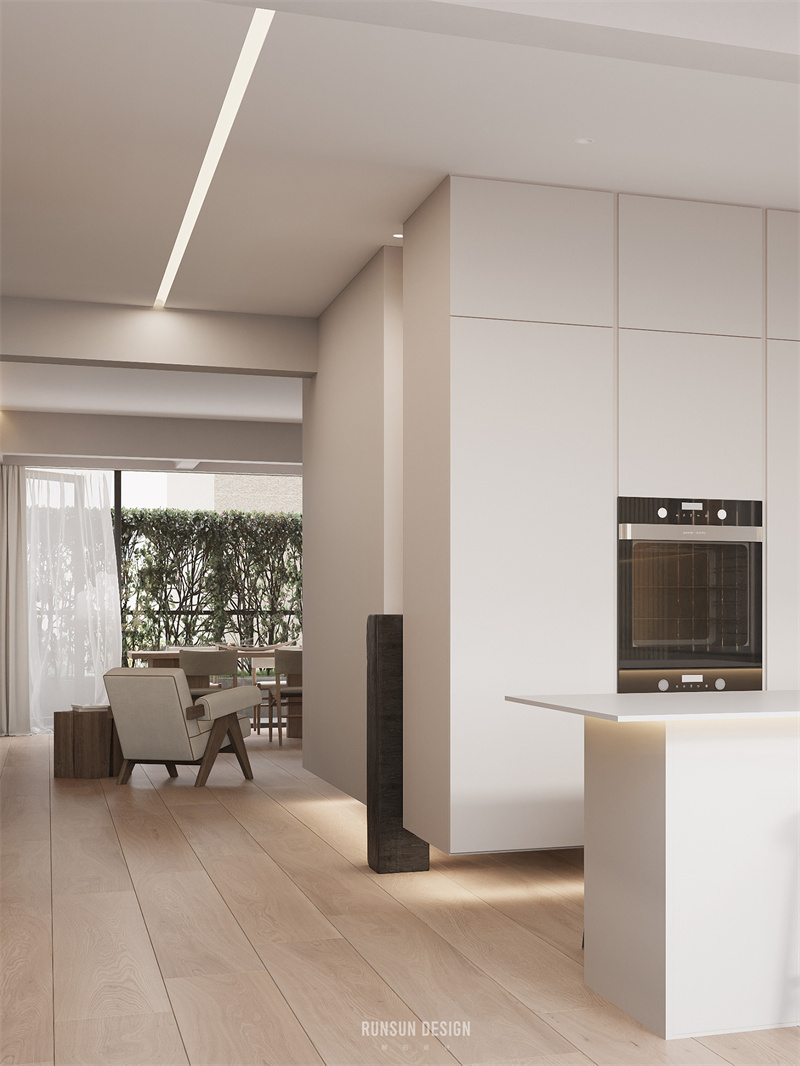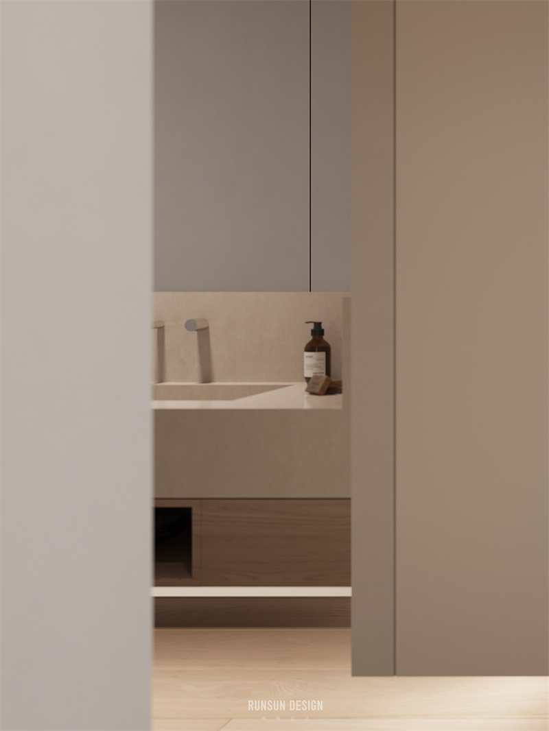 本案設(shè)計中,于玄關(guān)處設(shè)置懸浮的柜體,而在柜體周圍創(chuàng)造環(huán)繞的行走動線。將玄關(guān)、餐廳、廚房、客廳、外衛(wèi)干區(qū)這些空間通過柜體串聯(lián)起來。進入這套居所,第一感覺仿佛擴大了整個居所的空間體量。所有空間似隔非隔,風(fēng)水洄游,氣韻靈動。