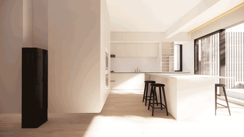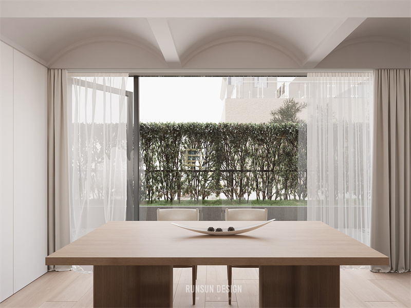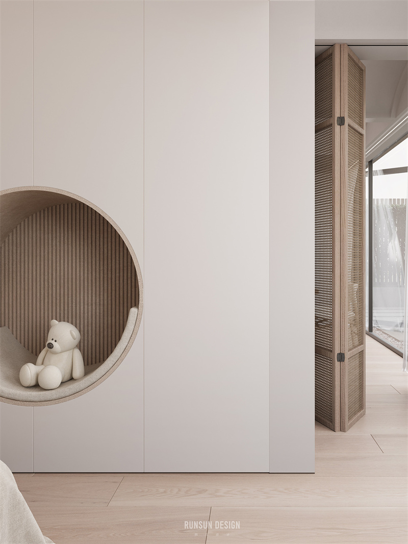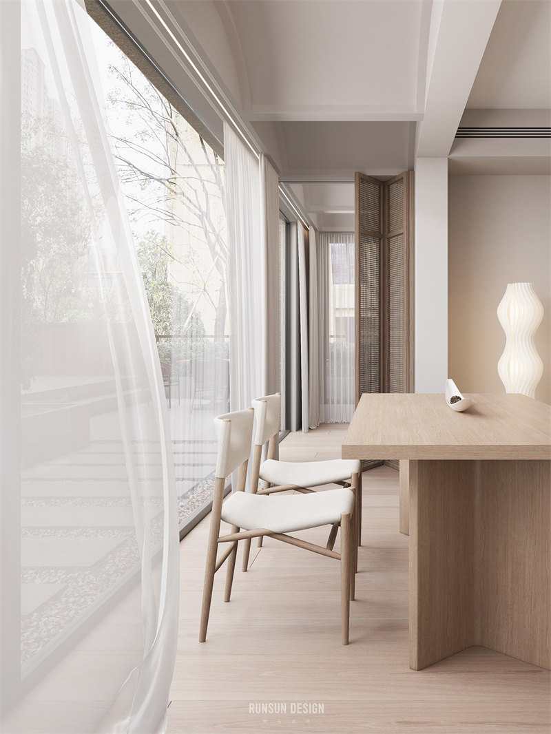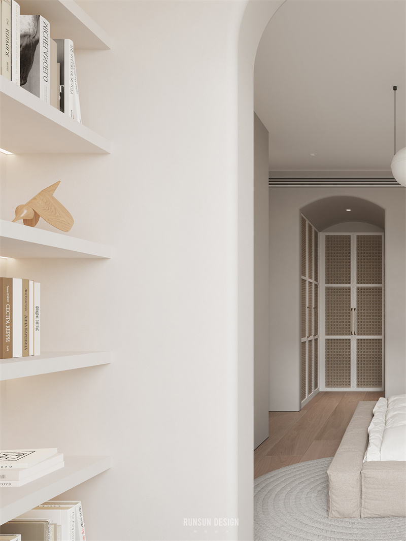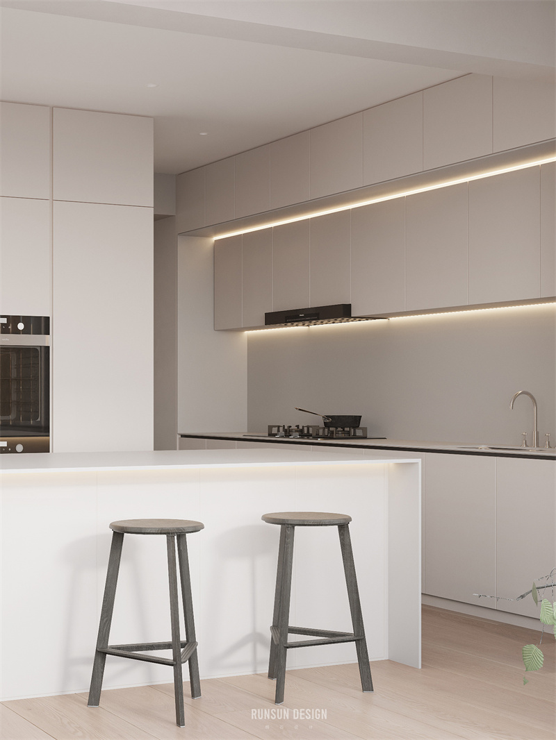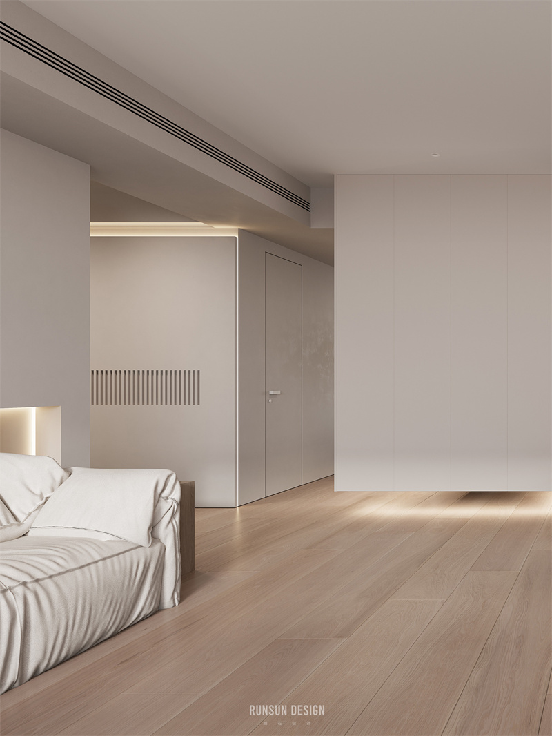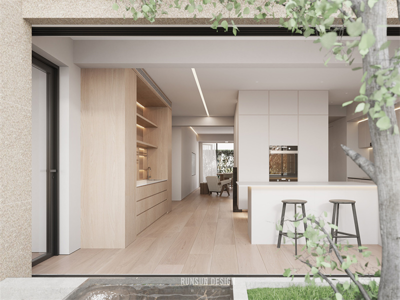 本案設(shè)計中,于玄關(guān)處設(shè)置懸浮的柜體,而在柜體周圍創(chuàng)造環(huán)繞的行走動線。將玄關(guān)、餐廳、廚房、客廳、外衛(wèi)干區(qū)這些空間通過柜體串聯(lián)起來。進入這套居所,第一感覺仿佛擴大了整個居所的空間體量。所有空間似隔非隔,風(fēng)水洄游,氣韻靈動。