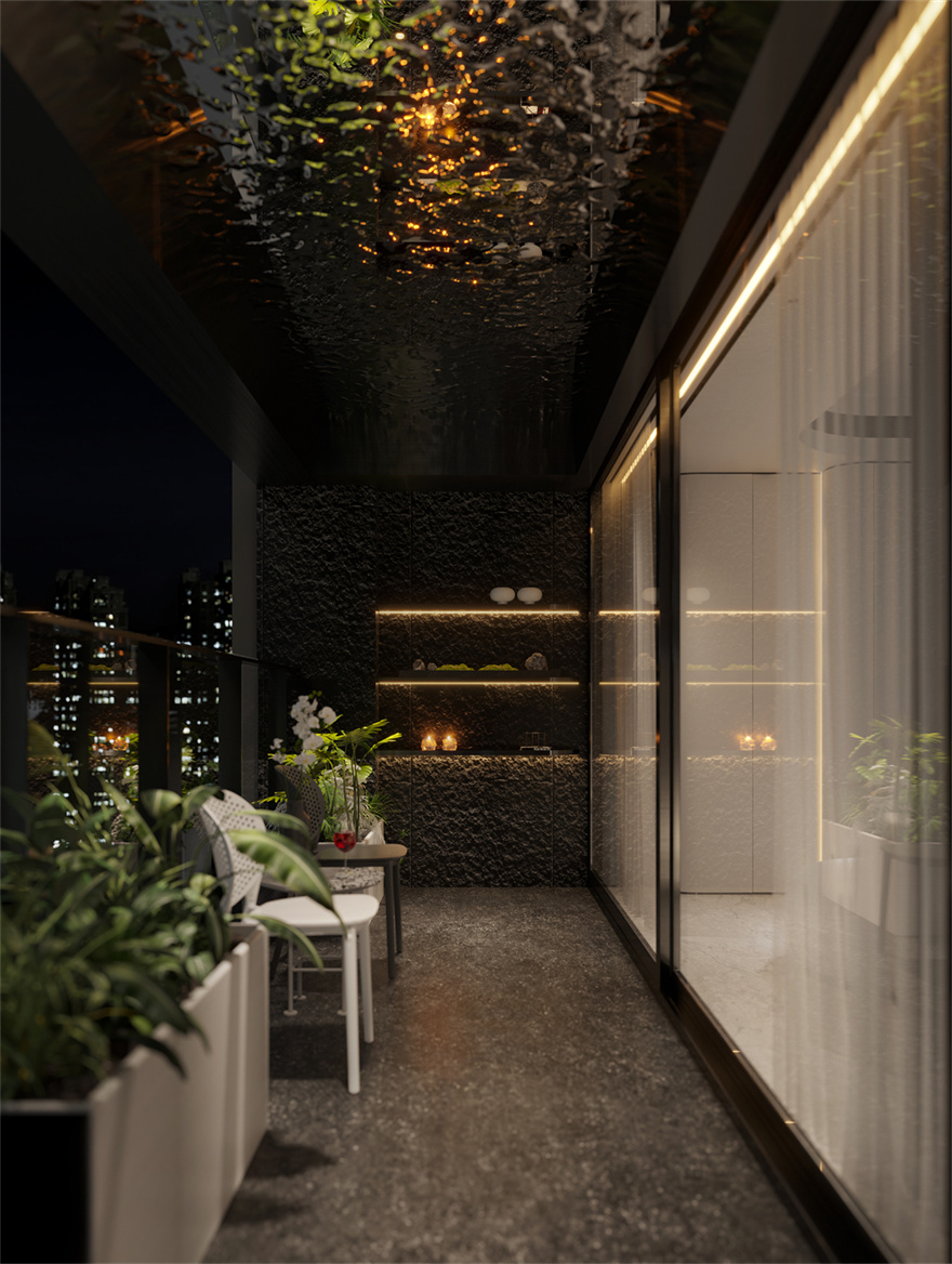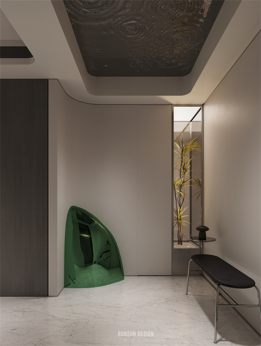 用金屬材質(zhì)與燈光構(gòu)筑的春水的意象,讓整個現(xiàn)代空間呈現(xiàn)出柔和的自然感與超凡的科技感。借助植物與天井的概念,將原本較為狹小的區(qū)域從視覺感觀上擴大,并引入了采光。同時從意境上雕琢了整個空間,仿佛“醉后不知天在水,溶溶春水浸春云。”