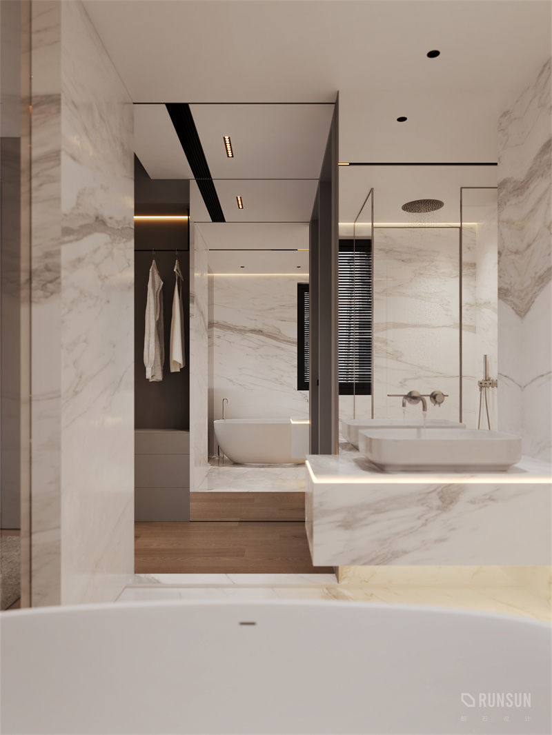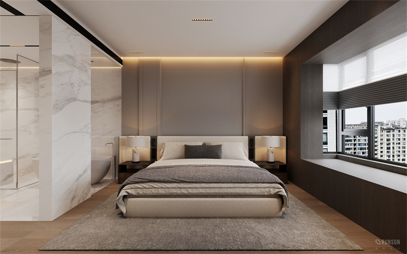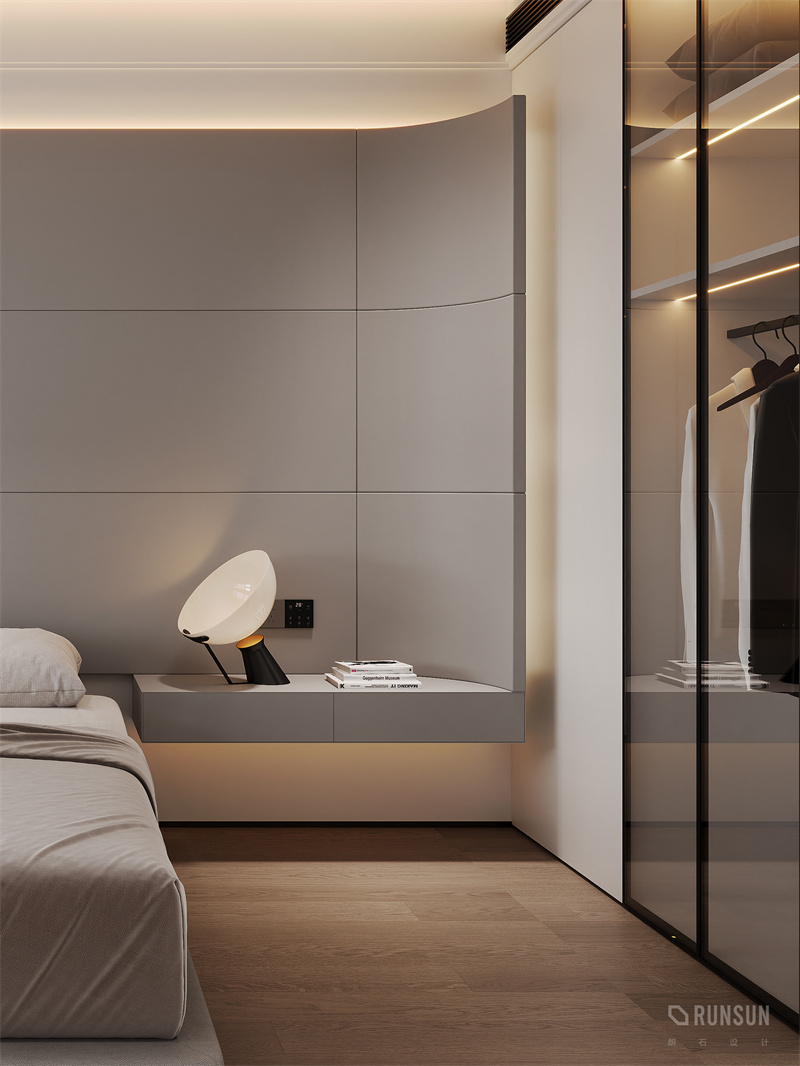 主臥與配套衛(wèi)生間由玻璃隔斷