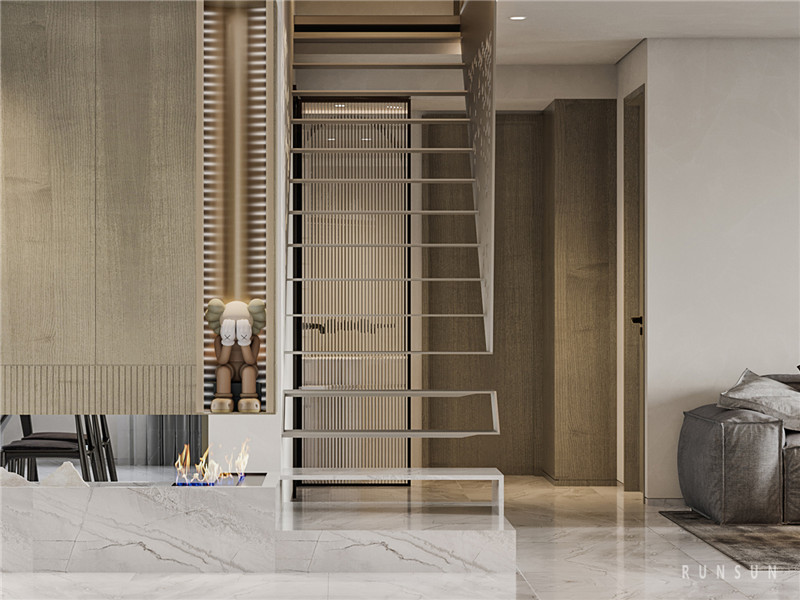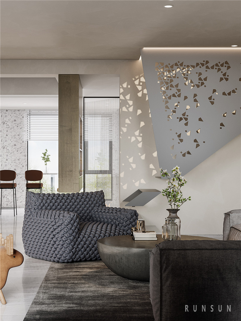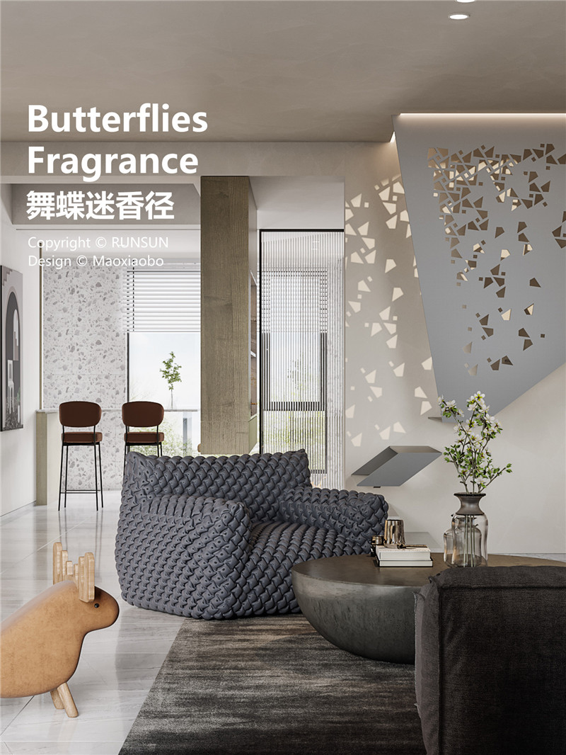 In this set of space, we have upgraded the urban plot artistically, and made the stairs a highlight of the whole space. The hollowed out iron stairs are transformed into a flying butterfly in the light of the lights, swaying in the intoxicating rrzcms space.